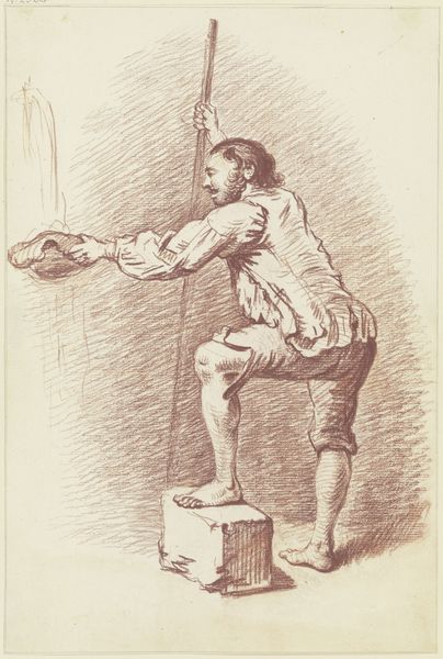 Friedrich Wilhelm Hirt created this sanguine drawing of a seated male model. Sanguine, from the French word for blood, is a drawing technique using a reddish-chalk, made from iron oxide pigment. Hirt deployed this material to create a warm, ruddy tone. Notice how the cross-hatching gives volume to the figure and suggests the rough textures of his clothing and surroundings. The drawing is a study; a way of developing skills and understanding human anatomy. Think about the artist’s labor here: the careful observation and the controlled hand movements required to build up the image through layers of fine lines. This contrasts with the life of the sitter, evidently a working-class man, whose own labor would have been physical and likely less appreciated. Hirt elevates him through artmaking. The drawing reminds us that all creative practices depend on a complex interplay of materials, techniques, and social contexts.
