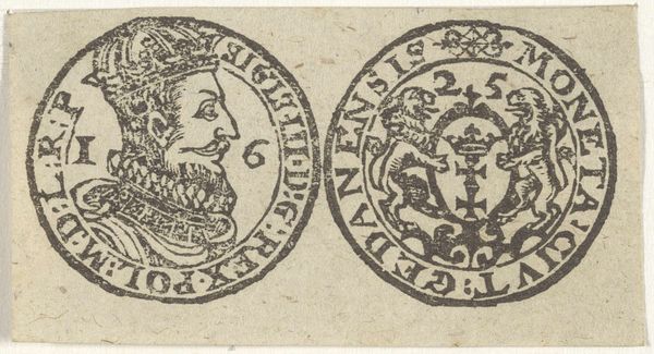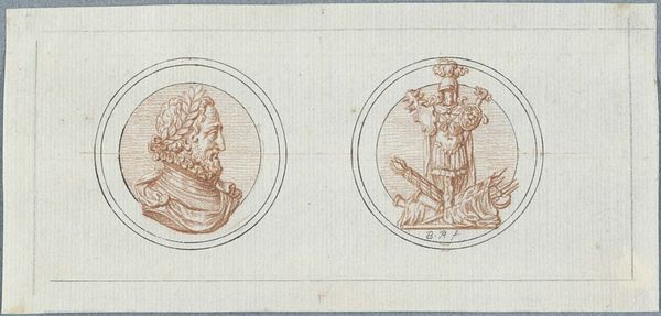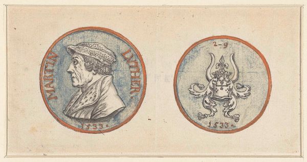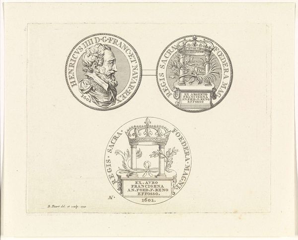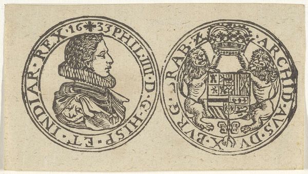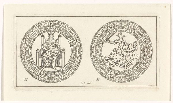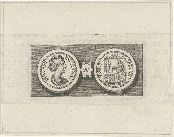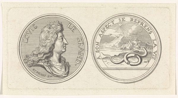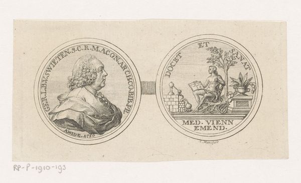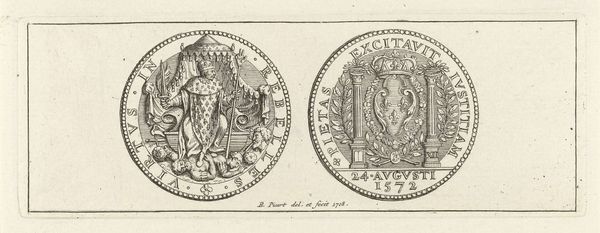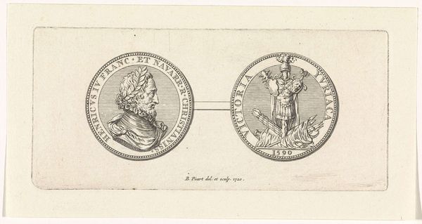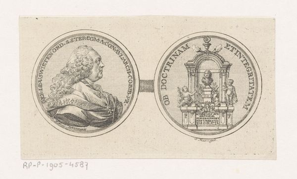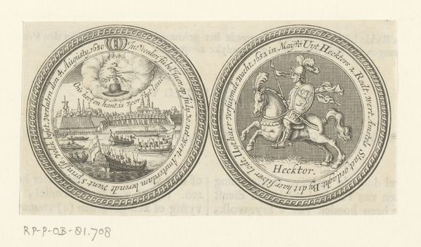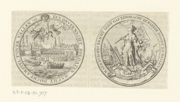 Curator: Today, we're looking at a piece titled "Penning met Minerva en leeuw met wapen van Leiden, 1574", created sometime between 1721 and 1723. It is currently held in the Rijksmuseum. It's an engraving, displaying two circular emblems. Editor: Well, my first thought is how perfectly symmetrical it is, and also rather solemn! The linear details forming the two figures create an almost classical aesthetic with the use of stark contrast and symbolic balance. Curator: Indeed. The piece offers a complex duality. On one side, we see Minerva, the Roman goddess of wisdom and strategic warfare. She stands poised with her spear, and accompanied by an owl, symbols deeply entrenched in classical allegories. The opposite emblem displays a heraldic lion, gripping a sword, emblazoned on Leiden's coat of arms. Editor: Right, Minerva suggests measured intelligence, while the lion symbolizes fierce courage and defense, which in a sense represents the strength and academic vigor in Leiden's history, it really adds to its complexity. Curator: The inscriptions, "PRETIUM NON VILE LABORUM PILEUS" around Minerva translates to "No mean price is the cap of labour", pointing to scholarly achievements. On the lion's side we have, "VIRTUTIS AVITÆ PREMIUM ACADEMIA DONUM CONSULUM LEYDENSIUM", which denotes "The academy, a gift from the consuls of Leiden, is the reward for ancestral virtue". Semiotically, the text emphasizes legacy and the value of academic success. Editor: And let's be honest, these early printmaking techniques evoke a feeling of antiquity and careful precision, all made more compelling because it feels incredibly detailed for a small scale artwork. Curator: Precisely. This engraving combines artistic technique with potent political and academic symbolism. The refined lines and circular composition unify both emblems, hinting at the interconnected relationship between civic pride and academic excellence. Editor: Thinking about it, viewing it today really inspires one to appreciate history. The careful artistry paired with powerful symbology offers, not just historical artifacts but it makes you consider the price and importance of learning, which remains priceless to this very day. Curator: I concur. The "Penning met Minerva en leeuw met wapen van Leiden, 1574" really provides us an intricate glimpse into Leiden’s self-image and values, manifested in art and symbols.