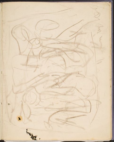 Here's a sketch from a notebook by Max Beckmann, made with graphite on paper. The quick, energetic strokes suggest that Beckmann was interested in capturing a fleeting moment, not labored perfection. The seeming spontaneity belies a sophisticated understanding of composition. Each line contributes to a complex layering of forms, creating a claustrophobic interior space filled with figures. The medium itself, graphite, lends itself well to the artist’s style, with varying degrees of pressure creating depth and shadow. We can imagine the artist quickly filling in shapes, the soft graphite gliding across the page to capture forms in a flurry of marks. This work gives us an intimate look into the artist’s process, the medium and methods used reveal as much as the subject matter itself. By considering these aspects, we can appreciate the skill and intention behind what might initially seem like a casual sketch.