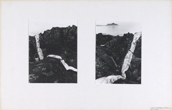 Curator: Here we have Jiri Kovanda’s work, "Two Little White Slats and Three Little White Slats, Autumn 1980, Vltava River, Prague." It’s a black and white photograph mounted on a larger sheet of paper. Editor: It's strangely calming. The subdued tones and the repetition of the white rectangles create a minimalist, almost meditative effect. Curator: Indeed. The slats introduce a subtle disruption within the natural environment, prompting us to question our relationship with the spaces we inhabit. Note that Kovanda documented the exact placement with a hand-drawn sketch above the photographs. Editor: Right, it seems Kovanda wanted to mark territory, but not in an aggressive way. By placing these simple objects, he highlighted issues of access and the politics of space. Curator: His actions prompt contemplation on our interactions with our surroundings. It is a transient intervention with lasting conceptual impact. Editor: It definitely prompts a sense of quiet observation. A gentle reminder to pause and reflect.