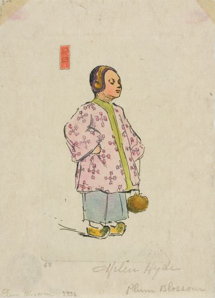 Editor: We’re looking at Helen Hyde’s “Miss Plum Blossom,” an etching from 1897. I'm really drawn to the delicate lines and how the artist captured this figure with such subtle coloring, especially that ochre robe with dark cross-shaped ornaments. What stands out to you when you look at this print? Curator: What captures my eye immediately is how this work engages with the Japonisme movement, that fascination with Japanese art that swept the West. It reflects a cultural memory filtered through a Western lens. Notice how Hyde, an American artist, adopts Ukiyo-e aesthetics, traditionally woodblock prints, translating them into etching, a very Western medium. Editor: So it’s a kind of translation, artistically and culturally? I can see the flat perspective reminiscent of Japanese prints. But how does it translate emotional meaning? Curator: Look closely at the girl's pose, hands behind her back, serene profile. It evokes both innocence and perhaps a subtle containment. Plum blossoms, culturally speaking, signify resilience and renewal in East Asian art. Her name links her to those themes. What emotional undercurrents might you infer? Is it confidence or youthful patience? Editor: Maybe both. I didn't connect the plum blossom to her name before, but it makes her seem more grounded, more connected to symbolic meanings beyond just being a portrait. Curator: Exactly. By entwining her portrait with culturally resonant symbols, Hyde not only participates in a visual dialogue but also opens up conversations about cultural exchange and the weight of symbolic inheritance. We bring our own contexts as viewers. It shows how even "borrowed" forms carry lasting meaning. Editor: That makes me see the image differently now, considering both its artistic style and those embedded cultural meanings. Thanks, that was insightful! Curator: And for me, considering your immediate appreciation of line and color helps underscore that effective visual symbolism depends upon those core elements.