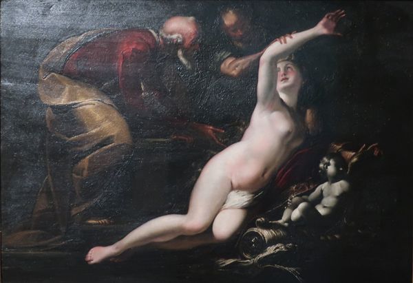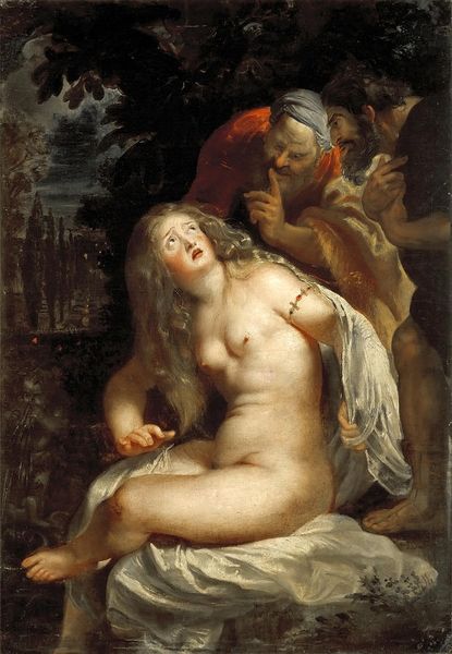Curator: Walking up to this canvas, you’re confronted by Giovanni Battista Tiepolo’s "Susanna and the Elders," painted in 1723. Quite a story unfolding in oils, wouldn’t you agree? Editor: It certainly feels charged, doesn't it? My first impression is one of shadowy menace punctuated by that creamy, almost luminescent skin tone. There's something not quite right in the space. Curator: Absolutely. Tiepolo plunges us into a biblical tale laden with lust and moral reckoning. Susanna, caught unaware by these leering old men in her bath. A symbol of beauty, innocence and purity under siege, don't you think? Editor: Exactly! It’s like a visual representation of that violation of privacy, tradition, and a woman’s dignity. That fear—her emotional vulnerability feels really raw even after all these centuries. But isn't Susanna also a symbol of resilience? Curator: Indeed. She chooses integrity over their twisted power, eventually escaping with her virtue intact, remember? And isn't it intriguing how Tiepolo plays with light, emphasizing Susanna’s vulnerable flesh and contrasting it with the elders’ darkened faces, symbolic of their hidden motives? Editor: The power dynamic is obvious. Notice the asymmetry? Susanna and the viewer are in the light while the elders plot and connive in the dark—literally casting a shadow of their actions into the heart of the piece. So many paintings present women as simply the subject, without giving Susanna agency and intelligence; she has both and the knowledge of those facts makes the whole ordeal that much more difficult to face, let alone look at. Curator: She's not simply a passive victim—which is empowering, especially in art of this era! The baroque era had a tendency to use bright, light colors which Tiepolo is definitely demonstrating but that could almost have a second message that this kind of sin happens in broad daylight so people cannot claim ignorance as an excuse. Editor: Absolutely, in her ordeal she becomes a symbol of the eternal tension between truth and falsehood, vulnerability and predatory intention, right? It serves almost as a psychological study on corruption and abuse, which unfortunately remains perpetually relevant. Curator: Such powerful stuff! I find myself leaving with a deep unease, mixed with respect for her unyielding virtue under intense pressure. Tiepolo had something of a knack for really unsettling his viewers! Editor: Yes! In short, this image is much more than it appears, beyond surface-level beauty. Tiepolo creates a timeless symbol with layers upon layers of meanings on multiple, fascinating levels, of Susanna herself, and all the Susannas who have had to carry that symbolism, historically and still today.