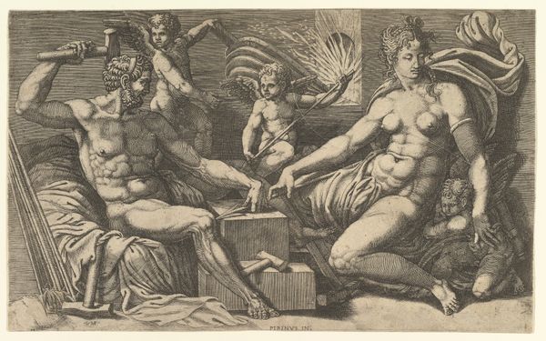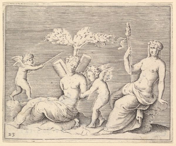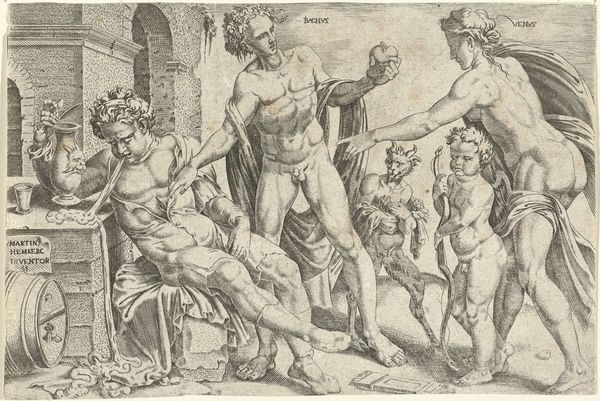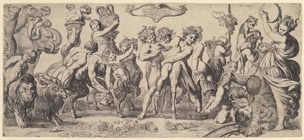 Editor: This intaglio print, "Bacchanale with Eight Figures," after Enea Vico, captures a scene brimming with revelry. What strikes me is how charged each figure seems, yet contained within this shallow, frieze-like composition. What can you tell me about how symbols shape our understanding of this piece? Curator: Indeed, the composition may seem spatially restricted, yet the symbols within explode with meaning. Notice the thyrsus, the fennel stalk carried by figures on the left. That represents not just Dionysus but also potency, fertility, and ultimately ecstatic release. Consider, too, the snake entwined around the male figure – a potent symbol across cultures of healing, but also earthly wisdom, linking us to chthonic forces. Editor: Chthonic forces? Like, forces of the underworld? Curator: Precisely. The Bacchanale, at its heart, concerns a descent into instinct, into the raw power of nature. The figures themselves, though classical in form, are depicted in various states of abandon; each gesture speaks volumes about the abandonment of reason in favour of primal experience. Look at the woman pouring from a vessel over her head. What associations does that conjure? Editor: Purification? Or perhaps obliteration of the self through ritual. It almost seems chaotic and orchestrated at once. I never would have considered how deeply these figures are rooted in broader human experiences. Curator: It speaks to our own continuing negotiation between control and ecstatic freedom, themes that continue to reverberate. The echoes of these ancient symbols speak to us still, do they not?
