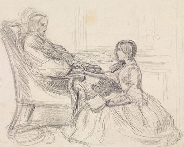 Curator: Here we have a drawing entitled "Vrouw op ziekenbezoek", or "Woman on a Sick Visit," created by Charles Rochussen, likely sometime between 1840 and 1860. It’s a pencil sketch. Editor: It feels remarkably intimate for a genre scene. The sketchiness almost gives it a sense of immediacy, like a fleeting observation. There’s a real softness to the figures. Curator: Rochussen was working during a period of increasing social awareness. How does that social consciousness inform this artwork, depicting a woman tending to the sick? This evokes themes of charity and social responsibility during that era, specifically how class differences and caregiving intersected. Editor: Absolutely, that compassion is palpable, but let’s not overlook the powerful imagery at play. Note the classical poses, reminiscent of pietas or visitation scenes – imbuing everyday suffering with a sacred aura. Consider how sickness was visualized across time; we see those motifs here. Curator: Right, we must acknowledge how social status plays into this representation. Was this seen as charitable work that elevated the caregiver’s social standing? Or, as someone from within that community merely extending care to one of her peers? How do their social roles affect their expressions and interactions within the sketch? Editor: The poses carry loaded symbols. The seated woman, seemingly resigned, recalls representations of melancholy or exhaustion—common tropes used to visually communicate sickness or hardship in art. Consider the woman sitting almost like an infant, huddled up, seeking comfort in their unwell state. Curator: It forces us to reconsider notions of “illness” as it intersects with social structures, and gender roles during Rochussen's era, especially the unpaid labor often imposed on women in the home. Were they truly seen and cared for themselves? Or are these visitations more performances for the patriarchy to be seen to do “good”? Editor: By exploring those visual and cultural cues, we see that even a seemingly straightforward genre scene becomes an intricate visual document loaded with meanings extending far beyond the surface narrative. Curator: This exploration reveals the crucial roles these women inhabit both through action and gesture in the 19th century. Editor: Exactly, a powerful case study illustrating how cultural anxieties get encoded within commonplace depictions.