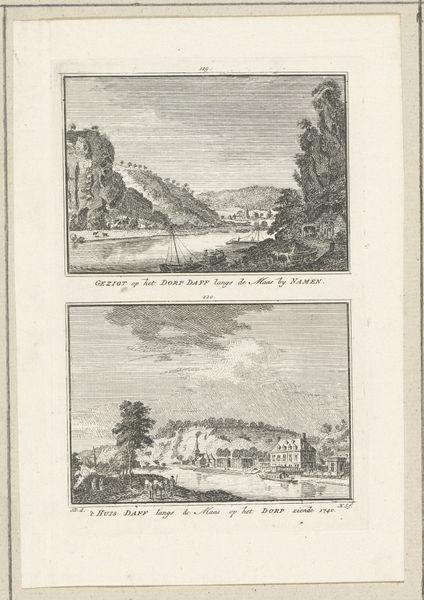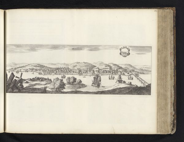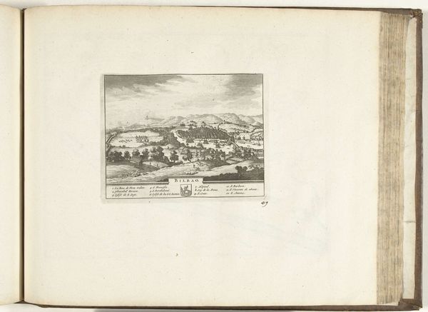 Editor: Here we have an engraving from 1734 titled "Gezicht op Spa," found at the Rijksmuseum and attributed to an anonymous artist. What strikes me is the almost photographic level of detail in depicting the town nestled in the valley. What are your first impressions of the artwork? Curator: The meticulous detail certainly captures attention. But I’m particularly drawn to how the artist uses linear perspective and tonal variations within a limited palette to create depth and structure. Observe how the crisp lines defining the bridge in the foreground gradually soften as we move toward the background. What effect does that have on the composition, in your view? Editor: I think it emphasizes the spatial recession, guiding your eye into the landscape. So the technique itself is critical to how we experience the scene? Curator: Precisely. The composition, particularly the balance between the dark hillside on the left and the lighter open fields on the right, creates a visual equilibrium. Notice also the calculated placement of architectural elements; the spires punctuate the skyline, providing a visual rhythm. Does the architectural style have symbolic value? Editor: That's an interesting point. I suppose the prominence of church spires hints at the town's values, or at least its self-presentation. This engraving is more than just a topographical record, then. It’s making an argument about the town and Baroque style? Curator: It’s about conveying a sense of order and harmony within the urban space. This approach also prompts the observer to delve into underlying principles guiding this structured vision. What does the visual rhetoric communicate beyond a literal representation of Spa? Editor: Thinking about it structurally helps decode it. I focused so much on the detail initially. Curator: Indeed. Attending to formal elements sharpens understanding, revealing deeper resonances in the depicted environment. It’s a reminder of the communicative power inherent in art.