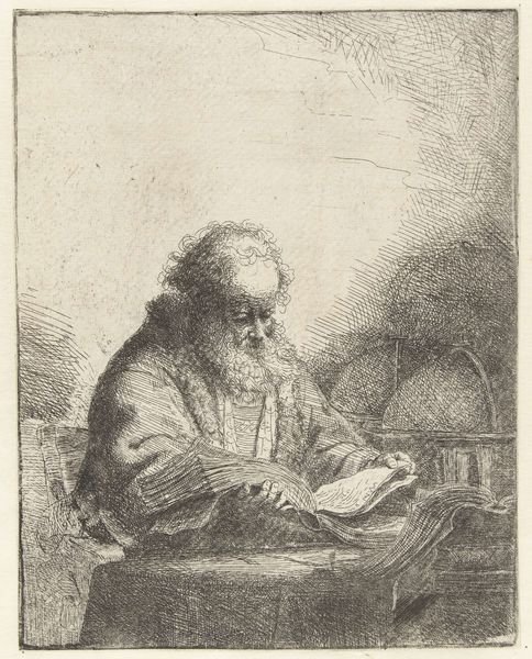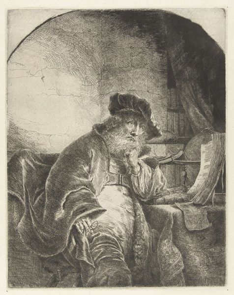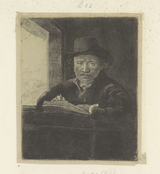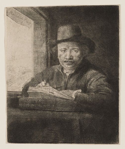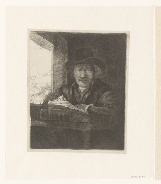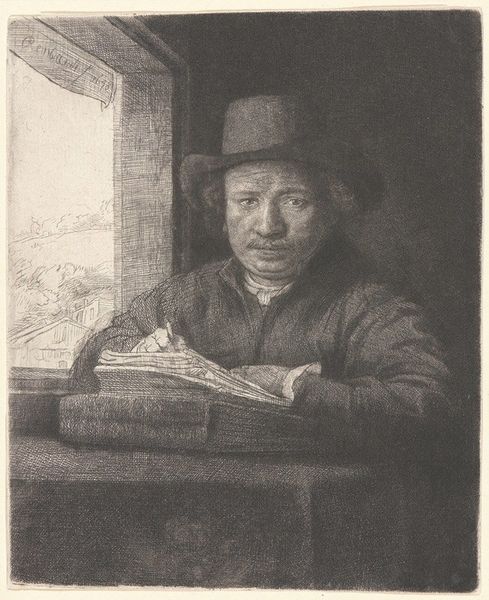 This is Rembrandt van Rijn's self-portrait etching at a window, an artwork of around 160mm in height and 130mm in width. Observe how Rembrandt uses the etching technique to create an interplay of light and shadow, a hallmark of his style. The artist portrays himself in a state of contemplation, leaning on a windowsill, a scene framed within the dark interior space. Rembrandt masterfully employs line and texture. Close examination reveals dense cross-hatching in the darker areas, creating depth and volume, contrasted with the lighter, more open areas that suggest illumination from the window. This is a study in contrasts. This self-portrait isn't just a depiction of the artist, but also an exploration of the act of seeing and representing. Consider how the window acts as a structural metaphor for the picture plane itself, framing the artist and his world. Note that Rembrandt's innovative use of light and shadow, combined with his introspective gaze, creates a work of profound psychological depth. The etching remains a powerful statement about the nature of artistic creation and self-representation.