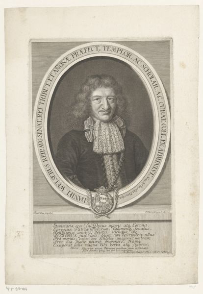 Curator: This engraving of Ulrik Frederik Gyldenløve… there’s a touch of melancholy there, don’t you think? Like a storm cloud trying to break through the official portrait. Editor: This is "Ulrik Frederik Gyldenløve," a print made by Albert Haelwegh sometime between 1665 and 1670. It definitely has a serious, almost somber feeling. All that text framing the image makes it feel pretty dense too. What jumps out at you when you look at this portrait? Curator: That density *is* part of the picture, isn’t it? Like life pressing in. It makes me wonder what stories that stern face could tell. Look closely—do you see the way the engraver captures the textures? The velvet cloak, the fur trim… they practically invite you to touch them, but that unsmiling expression holds you back. A little like a king surveying his domain. Editor: Definitely, that contrast between inviting textures and a severe gaze is interesting. It makes me think about power and representation, and how people wanted to be seen back then. Does the Latin text around the portrait tell us more about his role? Curator: Absolutely, the inscriptions around the image offer insights. "Aurant Regis per Norvegiam Vicarius” basically shouts, “Deputy King of Norway." In his own words, what do you imagine would Gyldenløve say of his service to the crown, successes, or his concerns? I wonder if he felt trapped by those titles. Editor: Hmmm, interesting, to think about his potential inner conflicts when we just see an image of officialdom! It seems a pretty elaborate image for its time. Curator: These early prints weren't just art; they were a form of social media. Imagine sending this out as a status update! What strikes me now is the lasting power of portraiture to evoke questions about who we are and who we perform ourselves to be. Editor: I see what you mean, a way of broadcasting power and status that still speaks to us centuries later. Thanks for shedding light on this, it made me appreciate what an amazing thing it is, to try and catch a real person through art!