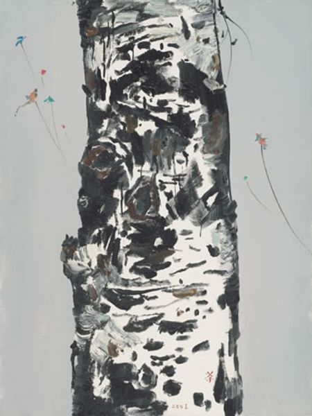 Editor: Here we have Ellen Gallagher's "Bird in Hand," created in 2006. It's a mixed-media collage. My first impression is of a strange, ethereal portrait that almost blends into its background. What stands out to you, and how would you interpret it? Curator: Immediately, I’m struck by the relationship between the figure and ground. Gallagher's application of materials creates a tension: figure and the surrounding space appear equally significant. Consider how the muted palette and intricate layering of textures complicate the reading of the subject's presence, obscuring a clear focal point. Does the ambiguity alter how you perceive its form? Editor: Definitely! The textures make it difficult to separate the figure from what’s around it. It’s almost camouflaged. But what about the specific shapes and their relationship? Curator: Note the organic, almost root-like forms at the bottom mirrored by the intricate 'foliage' above the figure's head. The symmetry is balanced, yes, but perhaps more importantly, the similar shapes create visual consonance. What affect might this compositional choice create for the viewer? Editor: I see what you mean! It feels connected... grounding? Curator: Precisely. Further consider the surface itself, notice the careful assemblage of diverse materials; how might these reflect her investment in revealing constructedness over realism, or perhaps exploring liminal spaces? Editor: I hadn’t thought of it that way, focusing on form and materiality really enriches the experience of viewing it. Curator: Indeed. Gallagher uses form not only to depict but also to suggest other potential realities. What we can’t name is, after all, just as powerful as what we can.