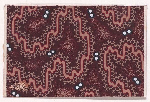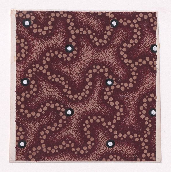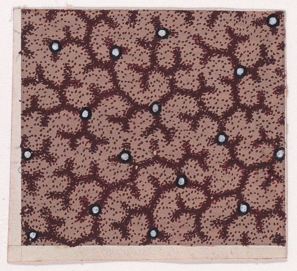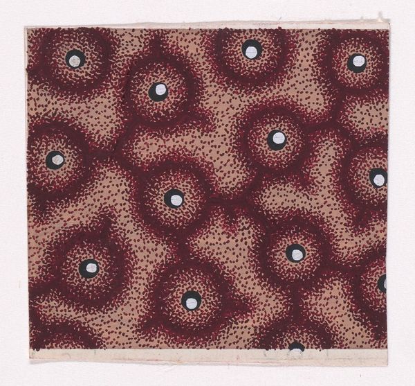 Curator: Looking at this, I see fields of heather and the faint glimmer of morning dew. Editor: What a perfectly utilitarian, repetitious design! One could stare into it and find all kinds of things…but to start, let’s establish the work itself. What we’re seeing is a textile design from around 1840, attributed to an anonymous maker. The piece is called "Textile Design with a Pattern of Garlands of Stylized Leaves Splattered with Pearls Over a Stippled Background." It currently resides at the Metropolitan Museum of Art. Curator: Those pearl-like orbs…the constant field of repeating foliage—it feels almost hypnotic. Perhaps this was intentional; many symbols associated with domestic textiles possess a long history with healing, health, and general well-being. These recurring natural patterns speak to ideas of rebirth. Editor: Interesting interpretation, although my eye is immediately drawn to the probable production method of the original textile. It seems distinctly "low-tech" somehow—compared with later industrial techniques. The garland elements remind me of the textures one finds with block printing. I imagine craftspeople carefully layering dyes to create this very precise but intentionally “raw” surface. The final product, of course, probably landed far from our immediate frame. Curator: Precisely—imagine how different these emblems of the natural world look in their intended context. We would be further removed from any kind of handwork and yet it would still resonate with those meanings: of harmony, or even protection, depending on its purpose, as garments and fabrics served so many distinct purposes at this time. These garlands themselves might hold the clues to meanings we cannot readily access now. Editor: This definitely opens up a host of compelling ideas to explore concerning labor practices, material availability and modes of commerce at that time. Curator: Yes, so much we might speculate about the emotional and cultural investments that this design suggests. Editor: It prompts us to reconsider conventional understandings of artistry, commerce and cultural values in earlier textile industries.