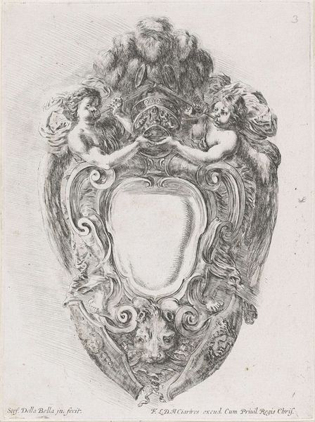 This is Stefano della Bella’s etching of a cartouche with two young satyrs, now at the Rijksmuseum. The print presents a symmetrical arrangement where two satyrs frame a central, shield-shaped void. Della Bella masterfully employs line and form to create a visually arresting composition. The figures, rendered with detailed cross-hatching, are muscular and dynamic, their forms softened by the whimsical, decorative elements surrounding them. The satyrs, mythical creatures, occupy a space between the human and the animal, which destabilizes the established categories of being. Above, Della Bella incorporates a cardinal’s hat and a helmet, emblems of religious and military power, thus engaging with themes of authority and representation. The semiotic structure here suggests a deeper engagement with power dynamics, where symbols of status are playfully integrated. Ultimately, the piece functions not merely as ornamentation but as a commentary on the very nature of symbols and the cultural codes they uphold.
