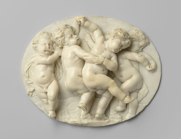This is 'Bacchanal of Satyrs and Cupids' by Gérard van Opstal, an ivory relief sculpture whose creation date is unknown. The composition unfolds horizontally, a frieze of figures densely packed yet rhythmically arranged. The eye dances across the surface, drawn by the undulating forms of cherubic bodies and mythical creatures. The milky hue of the ivory lends a dreamlike quality, while the texture, rich with intricate carvings, invites tactile exploration. We observe a scene of revelry, a bacchanal suggesting a world where boundaries blur. Satyrs and cupids entwine, figures of abandon and innocence juxtaposed in a single frame. This interplay challenges conventional morality, destabilizing fixed notions of virtue. Opstal uses the classical material of ivory to create a sense of timelessness, yet his subject matter subverts classical ideals of order and restraint. The relief doesn't simply depict a scene; it performs a disruption of established categories. This sculptural relief embodies a dialogue between form and content, inviting us to reconsider the very foundations of aesthetic and moral judgment.