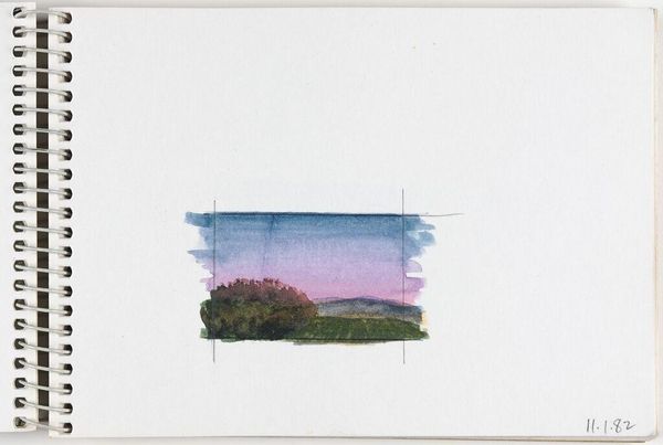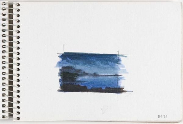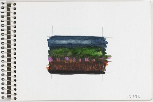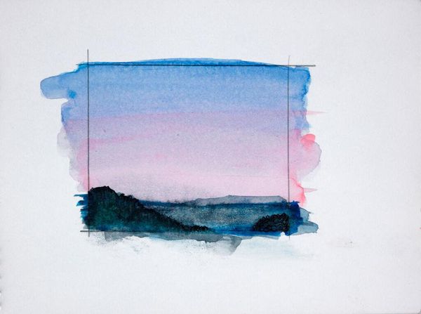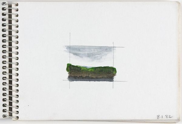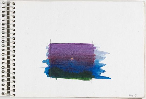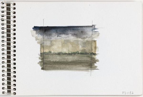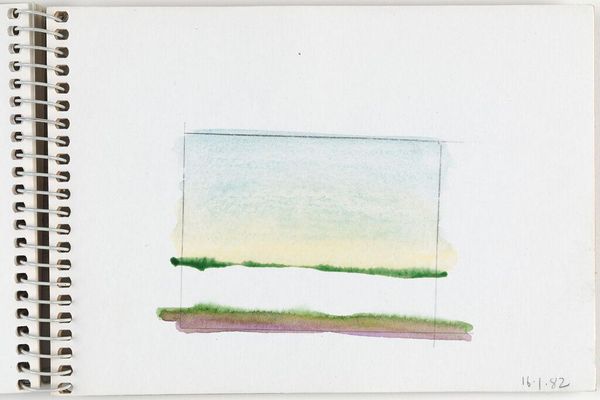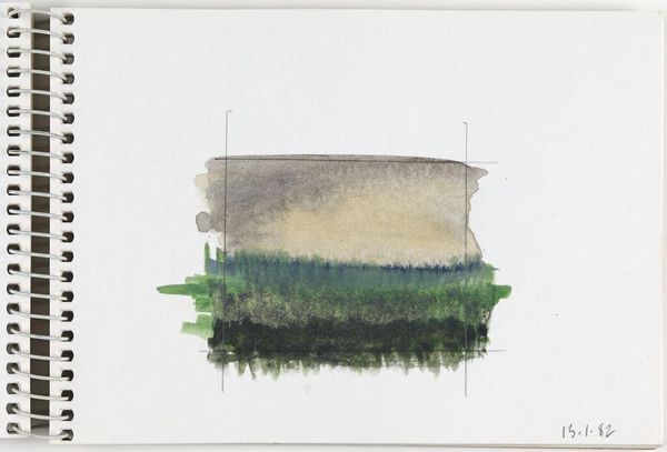 Editor: This is Elena Prentice's "Landscape," and it looks like a watercolor study. The quick, soft washes give it a dreamy, almost melancholic feel. What do you see in the way Prentice uses color and form in this piece? Curator: The composition relies on a stark horizontal division and a restricted palette. Notice how the upper register bleeds into the white space of the page, challenging the autonomy of the artistic gesture. Editor: So, the lack of defined edges contributes to its effect? Curator: Precisely. The permeable boundary destabilizes the conventional notion of landscape, reducing it to an interplay of color and texture. The two faint vertical lines further create a frame within the frame. Editor: That's fascinating; I hadn't considered the significance of the undefined edges. Curator: Considering the formal elements, one cannot help but question the boundaries of representation. Editor: I see what you mean; it pushes me to think differently about landscapes.