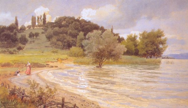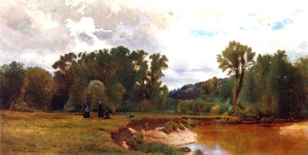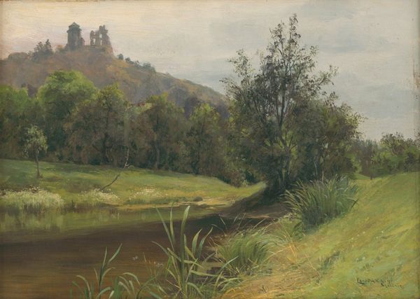 Curator: What strikes me immediately is the way light infuses this scene; the dappled greens and browns lend such a calm air to the entire work. Editor: Absolutely. This watercolor, "Andelven, Eidsvold" by Hans Gude, painted in 1853, perfectly embodies that 19th-century romantic ideal of the picturesque landscape. One could imagine the rising tide of Norwegian nationalism was at least partly supported by these idylls of the land. Curator: You’ve hit upon something there; consider how the placement of the houses nestled into the scenery presents a carefully constructed harmony. Is it representative of how people lived, or how they *wanted* to be perceived to live? Editor: Exactly! The idyllic quality, though, hinges greatly on its composition. Gude uses the river as a gentle curve that guides the eye deeper into the painting, using a simple foreground-middle ground-background scheme. Curator: Note also the texture Gude coaxes from the watercolor. It suggests not only the immediate landscape but also hints at the more wild nature of the region, which was significant for creating a distinctive national identity. We’re seeing that tension played out on the paper. Editor: It’s interesting to consider how, while aiming for realism, Gude's focus on harmonious arrangement still shapes our experience of the scene. Consider the colors: the warm greens and browns of the hills are beautifully echoed by the cool blues and greys of the distant mountains. This builds the image of a perfect, self-contained world. Curator: And Gude's deliberate arrangement speaks to a society keen on presenting an image of stability and cultivated beauty. One must remember Norway at the time was undergoing social changes; landscape painting became crucial to defining and promoting ideas of home and nationhood. Editor: This careful selection of color, the play of light, it's almost as if we’re invited to pause, breathe, and lose ourselves in its visual tranquility. Curator: Well, it is more than just tranquility, of course. The painting serves as a quiet assertion of cultural value, embedding a political narrative into the beauty of the land. Editor: Precisely. I think Gude makes us reflect not only on the beauty of the scenery, but also the sophisticated hand that captured the land, its social ideals, and perhaps…some level of fantasy, all with a few brushstrokes.