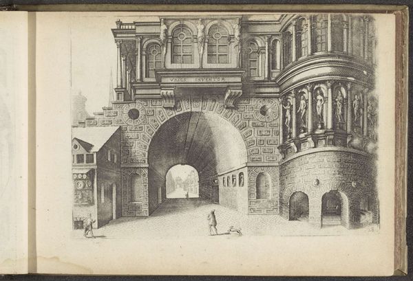 Editor: So this is "View of a Canal with a Bridge and Stairs to the Left" by Johannes or Lucas van Doetechum, created sometime between 1562 and 1601. It’s a print – an etching and engraving. There's something about the heavy lines that create such sharp contrasts; what catches your eye? Curator: It's a fascinating snapshot of civic identity. Doetechum gives us, literally, a bridge – and stairs! – to understanding Dutch cultural memory. Look closely. Does this scene strike you as wholly unique, or does it echo something deeper in the collective consciousness? Editor: I can't say that it is something that jumps right out at me. Curator: Consider how water, bridges, and the elevated perspective repeatedly appear in Dutch art and life. Waterways were vital for trade and defense; bridges symbolized connection and prosperity. Even those imposing steps could symbolize a rise in fortune. Do you get a sense that the artist saw the architecture itself carrying a deeper message? Editor: You mean that it may be a representation of societal advancement and unity, rather than merely bricks and mortar? The symbols are really there, and so overt! I would have glanced over it. Curator: Exactly! The placement of architectural elements, especially when heightened like this, contributes to how people relate to, and even move within, their environment. It subtly reinforces a sense of order, aspiration and collective achievement. Think of the light here. Is it about pure visibility, or about illuminating cultural values? Editor: That's a profound way to interpret such a seemingly simple cityscape. I see it now: this image tells a story far beyond what’s immediately visible! Curator: Precisely. By deciphering the symbolic language, we access a deeper understanding of the past and its impact on the present. I may look into more of this, myself. Thank you!