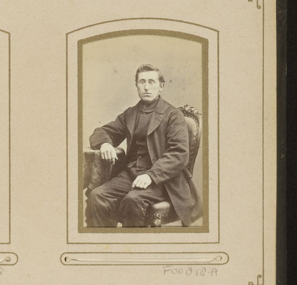 Curator: Ah, yes, here we have a fascinating portrait. This is "Portret van Frederik Karel Antonius Pantekoek" created sometime between 1850 and 1878 by S. Carspel. The piece uses early photographic methods. Editor: The first thing that strikes me is how staged everything appears. A very controlled stillness permeates the whole scene—rigid composure but then again he also seems at ease, perched gently on his seat, relaxed gaze, almost as if frozen in time. Curator: Photography at this stage wasn't instantaneous like our digital cameras, no? One wonders about the laborious, almost artisanal processes involved back then, and how the technology shapes both the image and the social ritual of portraiture. I suspect that early cameras involved carefully made, complex machines and materials that make modern photography look so, so lazy by comparison! Editor: It does raise some questions about labor. Consider the sourcing of materials like silver or mercury—both essential for early photography—from mines, potentially exploiting colonial labor? Even the manufacture of glass for the photographic plates speaks to a complex system. Curator: It is compelling to think of photography as more than capturing a likeness, isn’t it? I am now trying to imagine the subject, Pantekoek himself; the duration of each pose, his thoughts, what clothes he chose that day, how long he prepared that perfectly balanced posture. He feels both utterly present and achingly absent. Editor: Yes, absolutely. But, even that carefulness hides layers of other less immediately visible materials that facilitated the representation that is available for us to perceive. Thinking about the historical reception too is worthwhile. How would someone consuming this photograph in the 19th century respond, what values or class assumptions underpinned the relationship between sitter, photographer and patron? It is an early commodification of an artistic process... I think! Curator: You know, I agree wholeheartedly. Gazing at this image, I initially saw it simply as a window to the past, to the life of one man and perhaps a comment about art in this era. However, your materialist lens forces a reckoning with the entire world that enabled and surrounded it and for that I am thankful. Editor: It seems like we both extracted valuable new perspectives that enrich how we appreciate the past using the photograph.