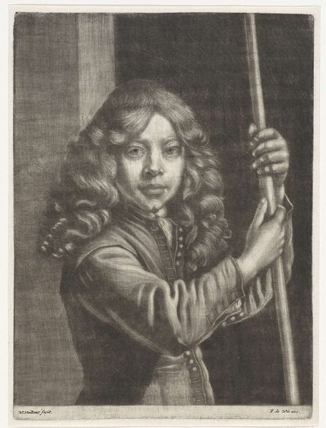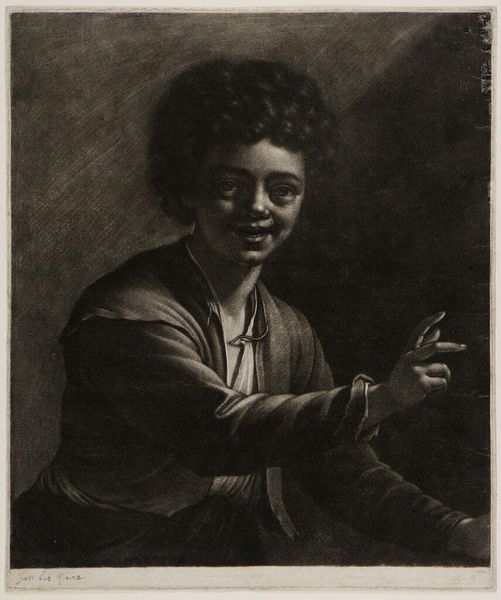 Wallerant Vaillant created this mezzotint, "Laughing Boy", capturing a fleeting moment of youthful exuberance. The boy's open smile and the gesture of his hand draws us into a world where joy is both immediate and infectious. Consider the symbol of laughter itself, how it transcends time. In ancient Greece, the laughing mask of comedy was a potent symbol in theater, designed to evoke catharsis through mirth. This image is linked to the Dionysian festivals, and it evolved, resurfacing in the carnivals of the Renaissance. The presence of laughter suggests a release from the everyday, tapping into our shared human capacity for joy. Note the boy's hand gesture: the pointing finger. This can be traced back to classical rhetoric, where gestures were carefully codified to amplify speech. But here, the gesture lacks a clear object, becoming instead an invitation, a beckoning into the boy’s world. Like a stone thrown into a pond, this simple image creates ripples of memory. It's an echo of shared human experiences and the enduring power of the symbol.