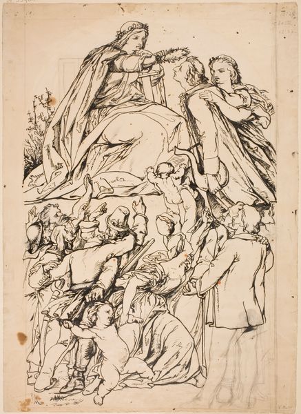 Jacob Jordaens created "Adoration of the Shepherds", a pen and brown ink drawing, while working in Antwerp. The composition immediately draws the eye to the Virgin Mary cradling the infant Jesus, around whom a cluster of figures gathers in reverence. Jordaens masterfully employs chiaroscuro. The strategic deployment of light and shadow creates a heightened sense of drama and spiritual intensity, guiding the viewer's eye through the crowded space. The dramatic light not only models the figures but also adds a layer of emotional depth, enhancing the sacred atmosphere of the scene. We may consider the significance of the gaze in the drawing. The figures' eyes—some cast downward, others fixed on the infant—serve as a focal point for the viewer's attention and create a network of visual and emotional connections. Ultimately, this drawing is an exercise in perspective. Jordaens not only captures a biblical scene but also invites the viewer to partake in a profound contemplation of faith, humility, and the divine made manifest. The artwork thus functions as a complex interplay of visual elements and a profound exploration of religious themes, leaving ample room for personal interpretation and contemplation.