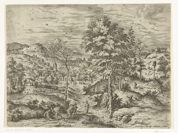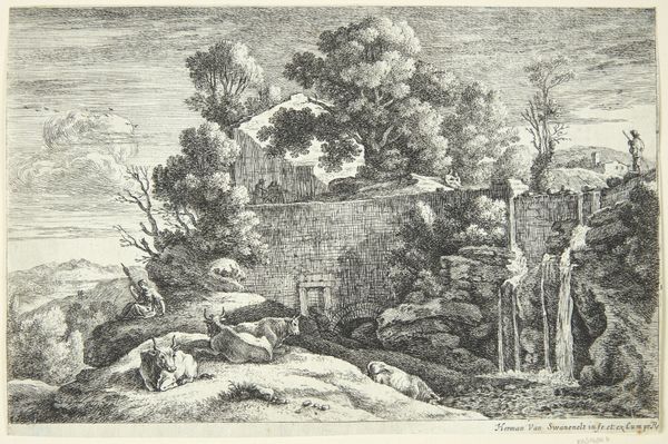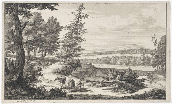 Curator: Looking at this etching by Adriaen van der Kabel, done sometime between 1630 and 1705, titled "Et ungt par i skyggen af et trae"—"A young couple in the shade of a tree"—I’m immediately struck by its airy quality. Editor: Airy, yes, but there's also something melancholy lurking there, wouldn't you say? The dense thicket on the left and the sharp, almost scratchy lines evoke a sense of unease, like the idyllic scene is about to be disrupted. It's beautiful, of course. That single large tree, taking up more than half the composition, dominates like some symbol of a lost Golden Age. Curator: I can definitely feel the melancholy. And that prominent tree to the left is central to understanding it all; its crooked and ancient boughs offer not only shade to the couple, but perhaps protection and concealment? Remember, the pastoral in art often holds complex symbols for everything from class to personal identity. Editor: True. The tree itself becomes a silent witness, bearing the weight of their story. Do you think that their relationship is important here? I think there’s something archetypal, almost biblical, about their hidden moment. They even resemble figures banished from Eden, don't they? And they’re set against this vast expanse – almost nothing separating them from distant mountains. Is the suggestion maybe to embrace their isolation? Curator: Banished from Eden or perhaps just hiding from a very human form of trouble. There are farm buildings on the far right and they could be escaping a chore for an hour. I like how van der Kabel uses ink so sparsely that it leaves it open to interpretation, to fill in the blanks of our own lost idylls. Editor: So beautifully expressed. The medium here really heightens that vulnerability. The very fragility of an ink drawing feels apt, as if their haven might disappear as quickly as ink on paper. Ultimately, maybe that’s why this baroque landscape still speaks to us, the yearning for something real within a world of fleeting impressions. Curator: A very thoughtful analysis! We fill it with our modern-day nostalgia, and the etching stands sturdy after nearly three centuries, doing its magic all the while.