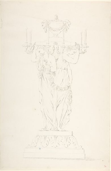 This is a drawing of a candelabra held by two women, now at the Metropolitan Museum of Art. The women, draped in classical robes, support a vase overflowing with vegetation, topped with three candle flames. This composition recalls the ancient motif of the Caryatid, figures often used as architectural support, embodying strength and grace. Here, the women appear to carry the weight of light and life itself. This motif echoes through history, from ancient Greek temples to Renaissance fountains, each iteration subtly altering its symbolic load. The vase, a vessel of potential and abundance, is a symbol that reappears in various guises across cultures. Think of the cornucopia, overflowing with nature’s gifts. These forms engage our collective memory, tapping into primal associations of nurture, fertility, and the life force. The very act of bearing a load embodies a deep psychological resonance, evoking feelings of responsibility, burden, and perhaps even pride. And so, the candelabra stands as a testament to the enduring power of symbols, a reminder that the past is ever-present, shaping our perceptions and emotions in ways both conscious and unseen.