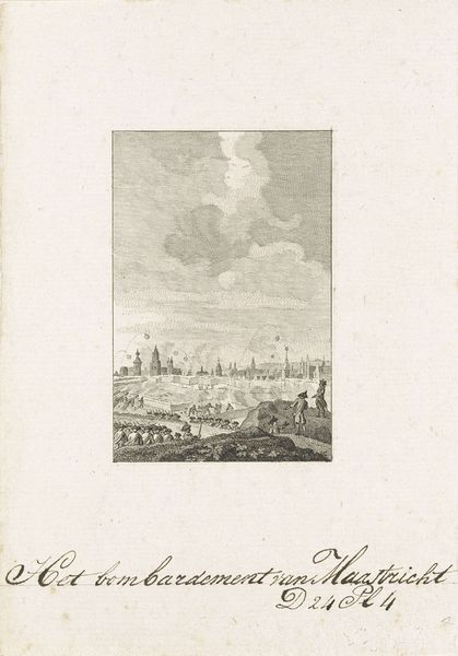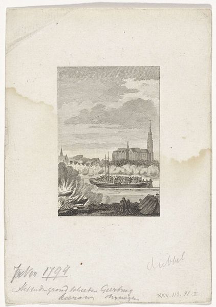 Editor: So, this is "High sea for Scheveningen" from 1790, by Reinier Vinkeles, it’s an engraving. It gives me a feeling of tension, seeing the sea so close to the village. What do you see in this piece, from your perspective? Curator: I see a powerful representation of the Dutch relationship with the sea, which has profoundly shaped their society and culture. Vinkeles captures not just a landscape, but a negotiation. The elevated perspective implies a certain degree of safety and distance, but we’re still drawn into the scene's immediacy and that feeling of tension. Editor: Negotiation is a great word! How did engravings like this one function back then? Was it like a postcard? Curator: In some ways, yes. Prints were vital in disseminating imagery to a wider public, especially before photography. This engraving offers a romanticized yet dramatic glimpse into everyday life in a coastal community. Its availability likely shaped how people perceived Scheveningen, perhaps promoting a certain image of resilience or even attracting tourism. Editor: So, it wasn’t just art for art’s sake? It was actually creating a public image. Curator: Precisely! Consider who commissioned and consumed such images. How did they influence ideas about national identity and the relationship between the Dutch and the sea? The politics of imagery were deeply interwoven with social and economic interests. It invited engagement; even those at a distance could observe a community seemingly wrestling with a powerful natural world. Editor: I see it differently now, it's not just the sea and some houses. There is almost a national story in this one image! Curator: Indeed. By considering the social context, an engraving such as this becomes an interesting case study, more than just a pretty scene of the coast.