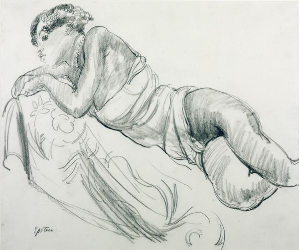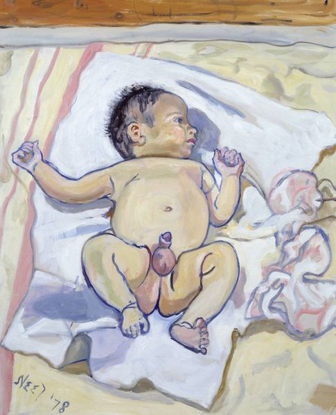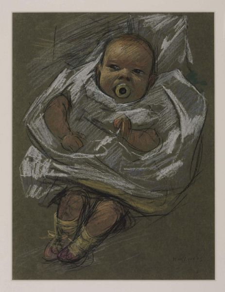 Editor: Here we have Samuel Peploe’s "Study of a Baby in a Bath" from 1910, executed in watercolor and drawing. The softness of the lines and pale colors give it such a tender, intimate feel. What do you see in this piece from a formal perspective? Curator: Formally, the work presents a fascinating tension between delineated structure and ephemeral atmosphere. Note how the swift, assured charcoal lines define the contours of the baby and the bath, anchoring the figure within the composition. But then observe the washes of watercolor, thinly applied, which bleed into and around the lines, softening the edges and creating a sense of depth and volume through subtle tonal variations. Editor: It's interesting how the sharp lines are almost fighting against the soft watercolor washes. Was this a common technique at the time? Curator: Precisely. Peploe's interplay between line and color isn’t necessarily innovative, but how he balances the elements creates dynamism within the work. The stark white of the bath acts almost as a void, pushing the viewer's eye back to the texture on the bottom half of the piece, with the various colors, the bold brush strokes and pink patches. Note also the minimal color palette. Editor: Yes, it's so limited. The greens and pinks are so carefully placed. What about the pose? The baby is almost crouching, which gives the scene a casualness to it. Curator: Indeed. The informality you observe is carefully constructed. The artist has achieved a balance through line work and careful rendering, making this artwork dynamic through Peploe's treatment of both form and subject. It shows us much in very few lines. Editor: I see it! It’s a lesson in careful and calculated economy. Thank you! Curator: A rewarding realization indeed!