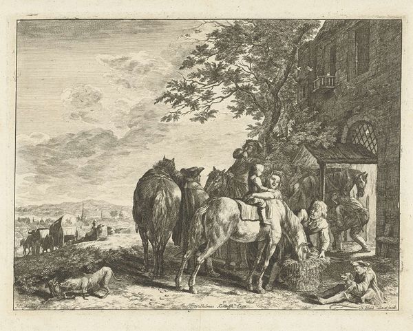 Editor: So, this is *Hoefsmid*, created sometime between 1658 and 1733 by Gerard Hoet. It's a print, an etching, or maybe even an engraving. It strikes me as rather...everyday, mundane almost, despite the dramatic Baroque style. What draws your eye in this piece? Curator: You know, “mundane” is interesting. At first glance, yes, a simple scene of a blacksmith at work. But Baroque wasn’t just for grand portraits. Look closer. See the precariousness in the horse’s stance, the lean of the building behind, etched lines dancing on the brink of chaos. What if Hoet is asking us to find the extraordinary in the ordinary? A life lived at the whim of industry. I find it very moving. Do you see that? Editor: I do see that, now. The horse does look rather…uncomfortable. But precariousness, even a little chaos in an image of such simple labour? Curator: Absolutely. Think of it. A horse being shoed was a vital component of pre-industrial infrastructure. Without strong horses the wheels of industry didn’t turn. The almost chaotic scene could be reflective of that time period? Editor: I see your point! I guess I initially overlooked the setting, the backdrop – it isn't just there for show. The whole composition speaks to a society reliant on these very everyday moments and labours. Curator: Precisely. Sometimes it's the simplest scenes that hold the deepest truths, isn’t it? To recognize art where others see the “mundane”… there's a joy to it. And that is the very beauty of *Hoefsmid*!
