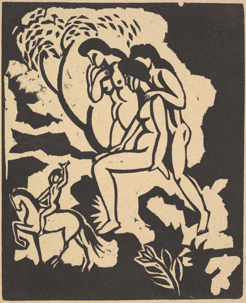 Heinrich Campendonk made this woodcut, Two Nudes with Horse, with simple tools and a vision for the unexpected. The stark contrast between black and white creates a kind of visual drama that feels both primitive and sophisticated. I love how the artist carves away at the wood, leaving behind these bold, graphic shapes. There’s a real sense of texture here, like you could almost feel the grain of the wood under your fingertips. Look at the way the figures and the horse are so intertwined, almost like they’re part of the same dream. Those little details, the spots on the horse or the simple lines defining the bodies, speak volumes. It reminds me a bit of Paula Modersohn-Becker's earthy figures, but with a surreal twist. It’s like Campendonk is saying, “Let’s not take things too seriously, let’s see where our imagination takes us.”