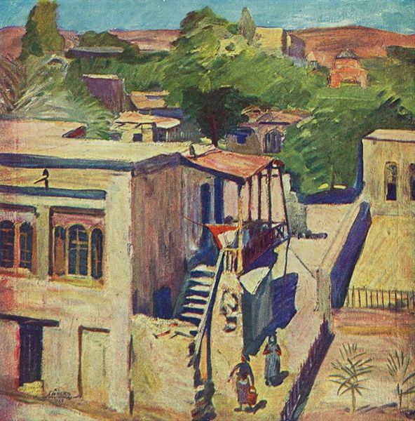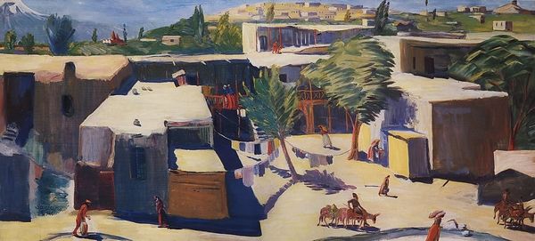 Editor: Here we have Denman Waldo Ross's watercolor, "Street Scene, Assouan, Egypt." I'm immediately drawn to the figures shrouded in shadow. What symbolic weight do you think the artist gives to these figures? Curator: I see the shrouded figures as a powerful symbol of cultural continuity. They evoke a timelessness, existing both within and beyond the architectural space, carrying the weight of history and tradition. Do you think the watercolor medium enhances this effect? Editor: Definitely, the fluidity softens the edges, almost blurring the line between past and present, inviting reflection. Curator: Indeed. It makes us consider how visual symbols can act as bridges across time, connecting us to distant cultures and experiences. Editor: It's fascinating how a seemingly simple street scene can hold so much cultural depth. Curator: Precisely. It encourages us to look closer at the layers of meaning embedded in everyday imagery.