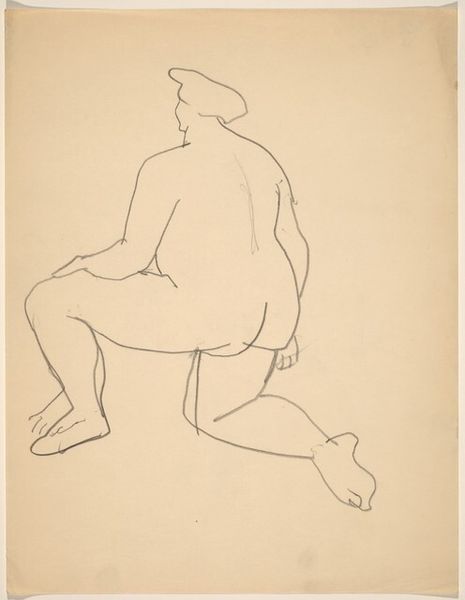 Editor: We’re looking at a pencil drawing by Mark Rothko, “Nude Figure Seen from the Back, Right Arm Supporting Torso.” The lines are delicate, almost hesitant, and it gives the figure a sense of vulnerability. What strikes you about this work? Curator: It's fascinating to see Rothko engage with figuration, particularly given his later commitment to abstraction. In academic art, the nude often objectifies, yet here the facelessness subverts that. Consider the historical context; during this period, artists were grappling with the legacy of classical representation while simultaneously questioning traditional power structures. Does the omission of the face empower the subject by denying a fixed identity, or does it erase individuality? Editor: That's a perspective I hadn't considered. I saw the lack of a face as more of a study of form, but I see your point about subverting the traditional nude. Do you think this drawing might reflect Rothko’s own struggle with representation and identity as a Jewish immigrant in America? Curator: Precisely. This early work, pre-dating his signature color fields, can be interpreted as a negotiation of visibility and invisibility. The nude, historically loaded, becomes a site for exploring themes of alienation, identity, and the complex power dynamics inherent in representation itself. It encourages us to consider whose bodies are historically visible, and under what conditions. What happens when we reclaim that gaze? Editor: It's interesting to think of this seemingly simple drawing as a kind of quiet rebellion against art historical norms. Curator: Absolutely. It reveals that even in the most traditional forms, artists can pose radical questions about selfhood and societal power. Editor: This has totally shifted my perspective. I will never look at another nude the same way again. Curator: And that’s precisely the point: to engage critically and historically. Now imagine how all these considerations pushed him toward the total abstraction he embraced later in his career!