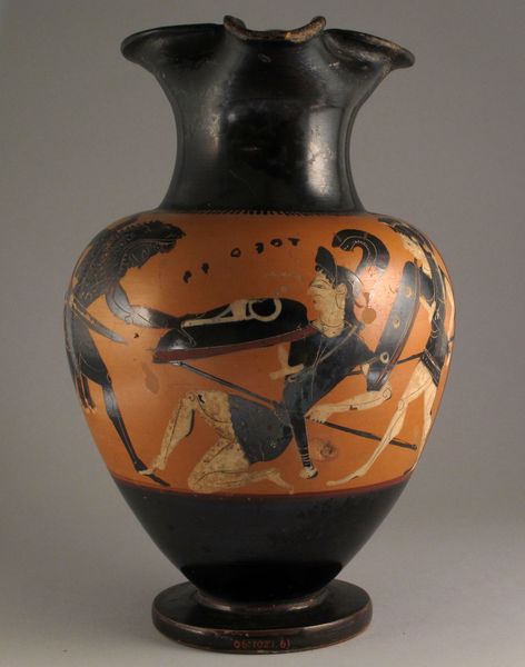 This Oinochoe, or pitcher, now at the Art Institute of Chicago, invites us into the visual and cultural world of ancient Greece. The vessel is structured around a stark contrast between the lustrous black background and the warm, reddish-brown figures. This color dynamic isn't merely decorative; it's a deliberate choice that elevates the composition. Consider the depiction of the seated woman. Her form is articulated through curvilinear lines that define the folds of her garment and the contours of her body, creating a sense of volume and movement. But note how the potter uses the negative space to further define her shape. These shapes interact within the defined space of the pitcher to form the visual narrative of a banquet scene. The scene is a semiotic system through which we might decode social rituals and aesthetic values of its time. The oinochoe transcends its function as a mere object, becoming a canvas that reflects the human desire to create meaning.