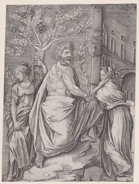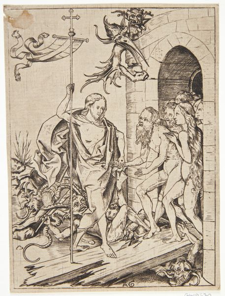 Editor: Here we have Israhel van Meckenem’s "Saint Christopher," a print on paper from the medieval period. I am immediately struck by the textures created by the engraving technique; it's all lines and the wave pattern is pretty unusual. How might we interpret the work from a materialist perspective? Curator: It’s precisely that labor-intensive engraving process, and its wider context, that’s key here. Prints like these democratized imagery. Think about the labor involved: the careful carving into the metal plate, the paper-making itself. This wasn't about unique artistry like painting, but replication. What implications does that have, do you think, for the artwork’s reception? Editor: So, rather than seeing it as a unique object of devotion, it's part of a larger system of production, making religious imagery more accessible? A kind of early mass production? Curator: Exactly. The lines, the medium…these are all evidence of production. Saint Christopher was the patron saint of travelers, right? Prints like these would be small, portable, readily available – imagine pilgrims buying them as talismans. The material process mirrors and reinforces the artwork’s intended function and audience. Is there anything else about the social or cultural context? Editor: Thinking about the time, wouldn't something like that disrupt or democratize traditional authority? The image isn't owned or curated by a single source... Curator: Precisely! It bypasses the church’s monopoly on religious imagery to an extent. Editor: I had not thought of it that way before. Understanding how it was made really helps me grasp the intentions and potential impact of the artwork. Curator: It's amazing how much looking at the means of production opens up the work itself, isn't it?