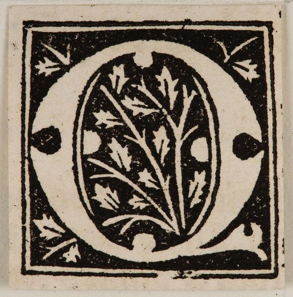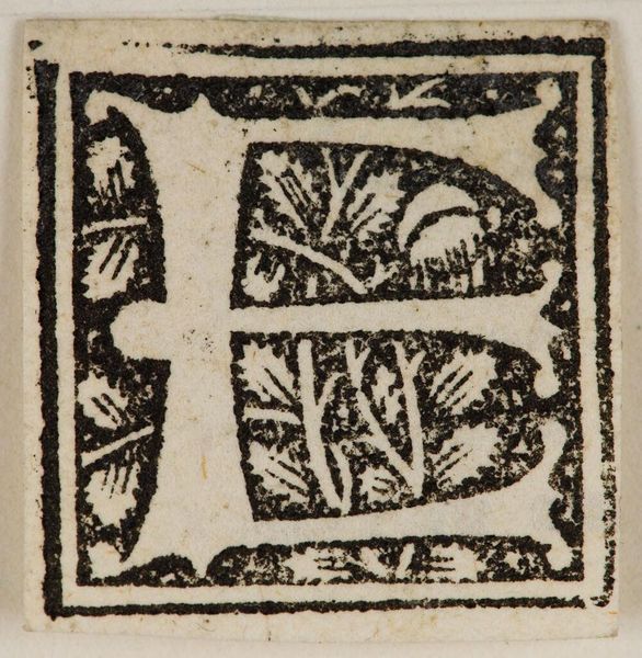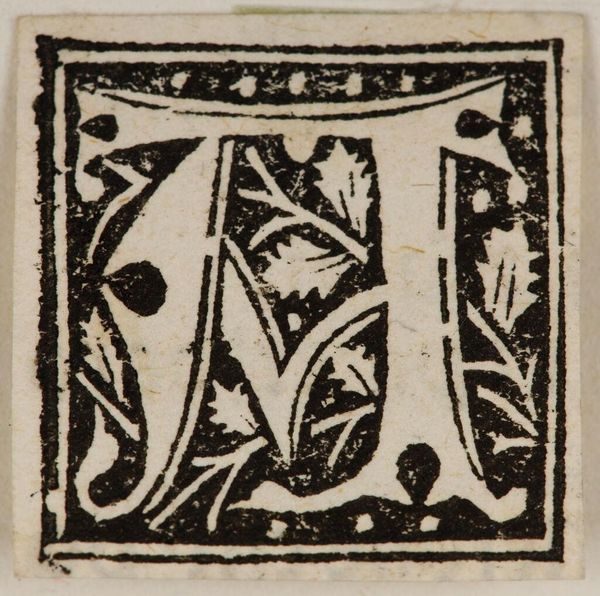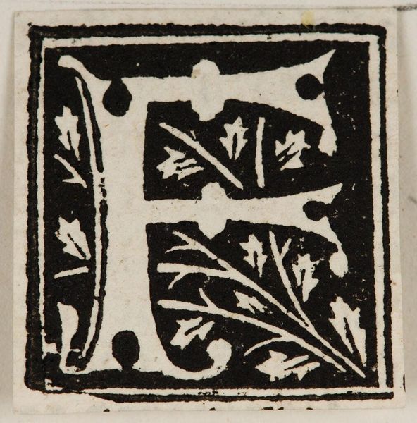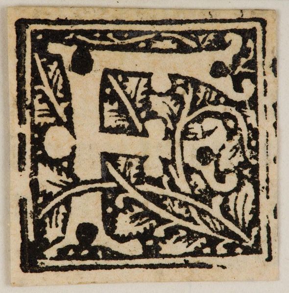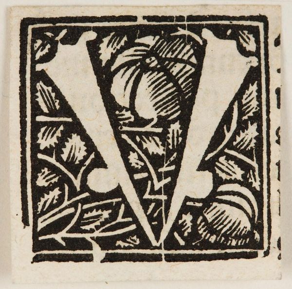 Editor: Here we have "Initial V" by an anonymous artist. It is a small block print, and I'm intrigued by the labor it represents; it feels very handmade. How would you interpret this work? Curator: Considering the materials, the woodblock's inherent constraints shaped the final image. Look at the texture, the grain, the evidence of the carving process. The contrast between the black ink and the white of the paper draws attention to the materiality, shifting focus to the means of production. Editor: So, less about the letter "V" itself and more about how it was made and what it represents, historically? Curator: Precisely. It’s about understanding the work through its physicality, through labor and consumption. Editor: That gives me a lot to consider. Thanks!