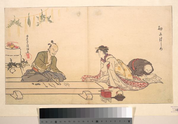 Editor: This woodblock print, "Asao Jujiro as a Cake Seller and Ikushima Shingoro as Bushi (Samurai) Seated on the Peddler's Lacquer Box Containing His Wares" by Okumura Masanobu, was created sometime between 1707 and 1711. I'm struck by the almost graphic quality of it. How would you approach analysing this work? Curator: Structurally, consider how the composition creates a dialogue. The two figures, spatially separate yet visually linked through line and form, create a sense of narrative tension. Observe the geometric shapes. The box, the packages, and even the stylized patterns on the robes—how do these hard edges contrast with the figures’ soft contours, creating a dynamic visual interplay? Editor: I hadn't thought about the contrast in shapes. Does the samurai's seated position on the box signify anything about power or status in the composition? Curator: Perhaps. Note how his immobility is set against the seller’s active pose, in motion to engage him. Consider, too, how the varying textures – the smooth planes of the faces against the intricate patterns on their clothing - add complexity, and note where textures mirror across the space. Does the cross-hatching serve simply to provide visual interest? Or might it convey symbolic intent? Editor: I see that the textures balance each other, creating harmony within the asymmetrical arrangement of the subjects. This tight balance between asymmetry and harmony contributes a really nice dynamism! Curator: Precisely. Through a meticulous examination of form, line, and texture, we begin to grasp the sophisticated structure underlying its design. What further reflections do you have? Editor: Looking at just the formal aspects gives me a whole new level of appreciation. Curator: Indeed, understanding structure allows deeper meaning to emerge.