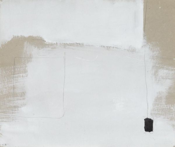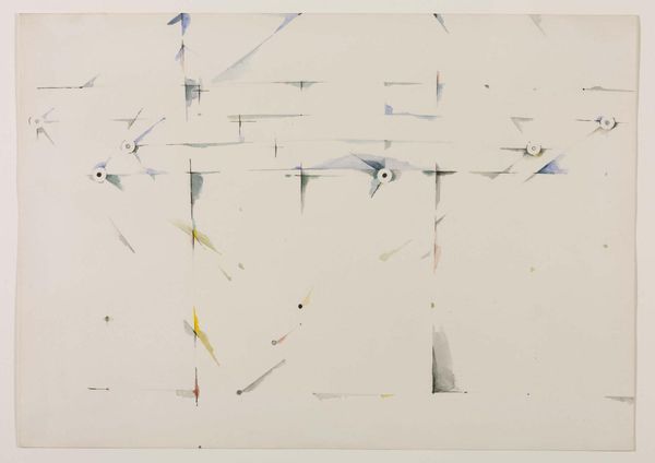 Editor: This is John Ferren’s "Untitled" from 1952, made with acrylic paint. There's such a subtle atmosphere, a sort of muted quietude that pervades it. I’m curious – what symbols or echoes do you see in this abstract work? Curator: It reminds me of looking at fragmented memories. The soft washes and barely-there lines suggest impressions rather than concrete forms. Do you see how the forms float, almost unbound, on the white canvas? Editor: I do, like half-formed ideas on the verge of disappearing! Is there any historical context that influences how to read these symbols? Curator: Well, post-war abstraction often grappled with expressing the inexpressible – trauma, uncertainty, a break from traditional modes of representation. Ferren, placing these near-geometric shapes and delicate pastel chalk drawings almost mimics the sensation of piecing together fragmented information. Consider how this period questioned traditional values, leading artists to create entirely new symbol systems. Editor: That's a helpful framework! The lightness now feels more deliberate. So are those very intentional choices instead of just accidents of process. Curator: Indeed. Do the floating shapes carry individual meaning or function collectively to produce something else entirely? That tension between isolation and unification could be key. Editor: Now I'm seeing a sort of psychological landscape. It’s like Ferren's mapping out the internal processes of thought itself. Thank you for sharing this with me! Curator: My pleasure! Seeing is never passive; it is always imbued with intention and emotion. It’s those symbolic readings that give art its enduring resonance.