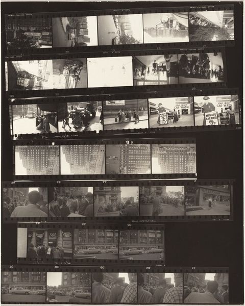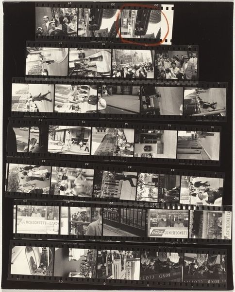 Editor: Here we have Robert Frank's "From the bus 70," a gelatin silver print dating back to 1958. Looking at this contact sheet, a series of street scenes captured in a monochromatic palette, I'm struck by a sense of fleeting moments, a visual diary of urban life. What narratives do you think Frank was trying to capture or convey with this work? Curator: That's a perceptive observation! Frank was indeed interested in capturing fleeting moments, but not just any moments. He sought out those interstitial spaces where the undercurrents of American society bubbled to the surface. "From the bus 70", like much of his work from *The Americans*, disrupts the carefully constructed image of post-war prosperity. The sequencing in a contact sheet like this emphasizes themes of alienation and the subtle segregation woven into the fabric of American life. Editor: Segregation? I see scenes of everyday life. Are you suggesting he was intentionally highlighting inequalities? Curator: Absolutely. While seemingly capturing daily life, Frank was drawn to what lay beneath: racial tension, economic disparities, and a sense of disillusionment. Even the grainy, high-contrast aesthetic was a deliberate choice, rejecting the slick, commercial photography of the time. He sought authenticity. Can you see how the fragmented composition of the contact sheet mimics the disjointed experience of those marginalized within society? Editor: That's a powerful interpretation. I hadn't considered how the format itself could contribute to that sense of fragmentation and social commentary. Seeing it this way really adds a layer of meaning I hadn’t noticed before. Curator: Indeed. Art is never neutral; it's always in conversation with the world around it. By examining the socio-political landscape in which "From the bus 70" was created, we can begin to understand its lasting impact on photographic representation. Editor: This has been incredibly enlightening; thank you for sharing your perspective! It’s fascinating how historical context can reshape our understanding of even a seemingly simple snapshot. Curator: The beauty of art lies in its ability to spark these conversations and challenge our assumptions. There is always more to see and consider.