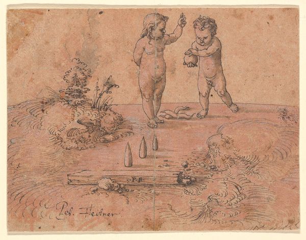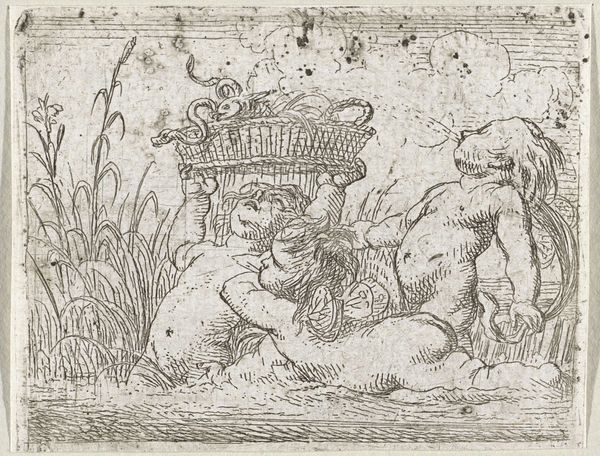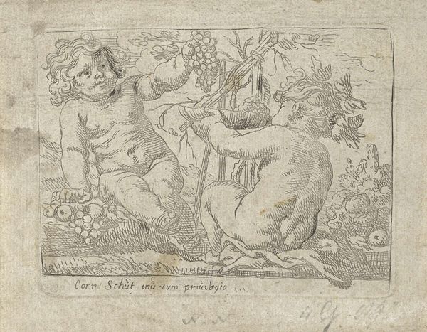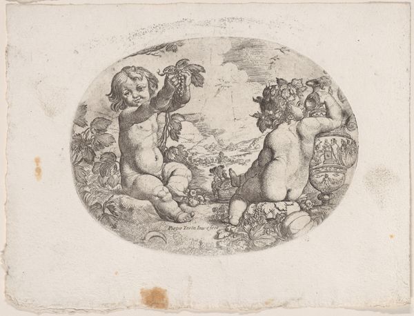Curator: Take a look at this engaging print, believed to have been created sometime between 1650 and 1680 by an anonymous artist. It is titled "Putto at left holding an upturned cornucopia and a garland, another seated at the right holding an urn, an allegory of the seasons (Autumn), an oval composition". Editor: Well, my immediate sense is abundance! The light and shade make those cherubic figures almost pop off the page, especially the one clinging to that oversized cornucopia—it's pure Baroque deliciousness. Curator: Precisely. Note the clever use of the oval composition. It confines the eye to a particular dynamic that animates these figures within this visual boundary. The putti are rendered with subtle tonal gradations that contribute to the illusion of volume and depth. Editor: Right, they're not just floating; you feel their weight. I imagine them giggling and playing against the landscape beyond. But I am drawn to the symbolism too—a kind of timeless echo of fertile fields, and overflowing harvests... and the vague promise of survival and joy in hard times. Curator: The cornucopia—filled to the brim with nature’s bounty—and the urn brimming with fruits certainly symbolizes autumn's prosperity and the Earth's life-giving capacity. The medium also offers certain symbolic suggestions; as an engraving, it lends a visual density well suited for a baroque aesthetic of exuberance. Editor: Exactly, and it makes you wonder, doesn’t it, who dreamt this up? The human touch feels incredibly delicate considering it's such an ordered and precise composition. It has me thinking about their own dreams of harvests. Did the artist manage to materialize their dreams into reality, one can’t know… Curator: That tension, that artistic labor, imbues this artifact with resonance that has lasted through time. From an academic vantage, analyzing the pictorial construction in concert with the overarching thematics provides rich insights into its allure. Editor: Agreed. The artist makes one reflect that a simple arrangement becomes a gateway. It hints at cycles—birth, growth, decay—all wrapped in chubby-cheeked innocence and the promise of rebirth. A visual whisper, passed on for centuries to us in the present day!
