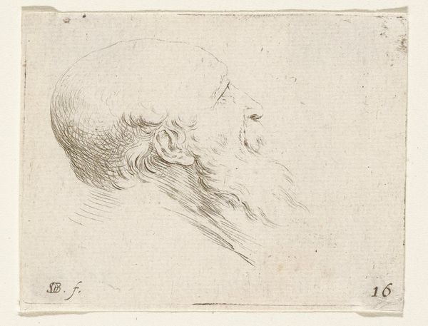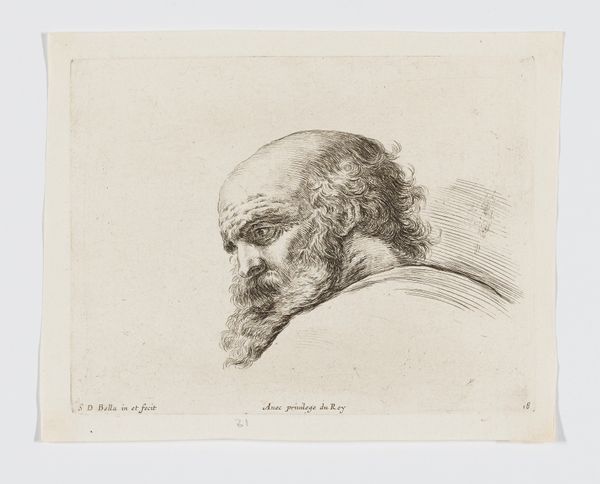 This etching, titled "Head of an Old Bald Man with Beard, in Profile to the Left," was created by Stefano della Bella. Bella's composition captures a somber mood through delicate yet assertive lines. Notice the contrast between the detailed hatching that defines the man's aged face and the more loosely rendered background, which flattens the depth of field and focuses our attention squarely on the subject's profile. The use of line is particularly evocative, as it not only models the form but also conveys texture, from the bristly beard to the soft fur collar. The figure's downward gaze and the stark simplicity of the composition evoke themes of mortality and introspection, a common preoccupation in art of this period. The etching's scale, intimate and precise, invites a close, almost private viewing experience. The man is caught in a moment of contemplation, prompting us to consider the broader human condition. The artwork's power resides in the convergence of technique and subject, allowing the artist to explore philosophical ideas about aging, perception, and the human spirit.