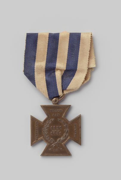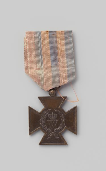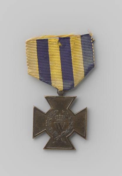 Curator: Here we have the "Metalen Kruis," or Metal Cross, dating from 1830-1831. It appears to be an example of early 19th-century metalwork, likely commemorative given its form and period. Editor: It feels…stark, almost brutal in its simplicity. The harsh lines of the cross and the faded ribbon don't exactly scream joyous celebration, do they? There’s a definite somber quality, especially with the visible wear and tear. Curator: Indeed, the Metal Cross embodies a certain austerity characteristic of post-Napoleonic Europe. Its materiality speaks volumes. The patina, for example, evidences the object's age, acting as a temporal marker that complicates its reading. Consider also the semiotics of the cross itself. Editor: The cross, naturally. But even its geometric bluntness pushes away any cozy symbolism, any romantic softness. The artist or craftsperson isn't inviting you in with open arms, that’s for sure! There are faded wreath-like flourishes. A sad sun of remembrance, perhaps? Or an austere acknowledgement of fallen figures. Curator: Precisely! And that geometric austerity you observed reinforces a sense of duty and perhaps sacrifice, reflecting the sociopolitical values ascribed to the decoration at the time. Structurally, the piece displays a rigorous symmetry that echoes classical ideals of order and balance. Editor: See, I initially missed that. It really does possess a tight visual organization that tempers its rough finish. It whispers of structure underneath all that aged material. Though, even understanding it’s symbolic and geometric considerations, I can’t help but respond to the emotion it triggers, it whispers stories. Curator: That affective response, although valid, may deflect from understanding the object's position within its specific cultural-historical context. But still, it certainly stirs a potent sense of what once was and, in the end, time tells its own tale on us all. Editor: You know, seeing it with that lens really allows you to see more into its value beyond its mere design. The journey to understanding art, a lifelong adventure.