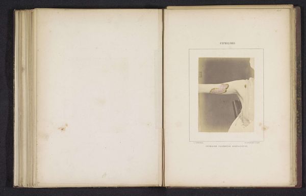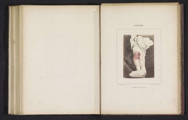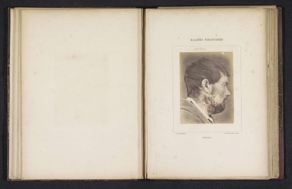 Editor: This is a page from a medical book, featuring a print titled "Portret van een onbekende man die lijdt aan favus op het hoofd," or "Portrait of an unknown man suffering from favus on the head," made circa 1860-1868 by A. de Montméja. It's…unsettling. The yellow scabs on his head contrast sharply with his otherwise somber expression. What do you see here, beyond the immediately obvious medical context? Curator: The yellow, you say. That resonates with me, recalling historical uses of yellow to signify the ‘other’ or the diseased within communities, marking individuals with a visible symbol of their ostracization. Do you think that association holds true here, or is the colour merely a descriptive element, devoid of such cultural weight? Editor: I hadn’t thought of it that way, but it adds another layer to the portrait. It makes me wonder if the man was aware of how society perceived his condition and himself through that. Curator: Exactly! Favus, being a visible ailment, likely transformed the subject’s public identity. This image then becomes a cultural artifact capturing not just a medical condition, but also the psychological impact of disease, mirrored in social perceptions. How do you think that changes our viewing experience? Editor: It makes me consider the weight of symbols—in this case, the colour, the visual sign of the disease. It shows that these visible symbols deeply affect our understanding and interactions. It reminds me to look beyond what’s immediately presented. Curator: Yes, these older images ask us to confront uncomfortable truths, prompting self-reflection on how societies treat those marked by difference or disease. Perhaps seeing such stigmatization makes one sensitive and hopefully, to some degree, prevents similar practices in the present.