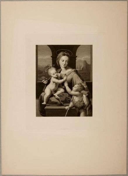 Editor: This is Narcisse Lecomte's "Holy Family," created sometime in the 19th century. It's a print, and I'm struck by the contrast between the dark figures and the brighter landscape. What do you see when you look at this piece? Curator: The printmaking process itself is key. Lecomte, likely working within a larger workshop, reproduced this image for mass consumption. How does the mechanical reproduction change the value and accessibility of the sacred image? Editor: That's a great point, how does making it accessible impact its meaning? Curator: It shifts it! The image, once perhaps a unique commission for the wealthy, now enters the homes of a broader public, influencing their understanding of family and faith through visual culture. It's about production and distribution. Editor: It's fascinating to think about the social impact of image reproduction! Curator: Exactly, the materiality of art shapes its meaning.