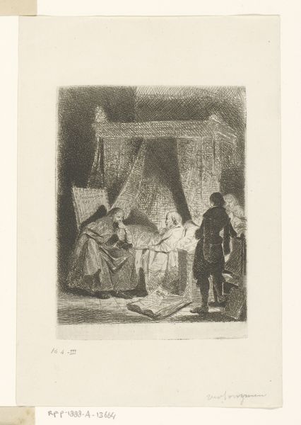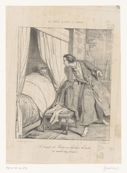 Editor: This is "Huismoeder met twee kinderen" – which translates to "Mother with two children" – a drawing from sometime between 1846 and 1863. It depicts a domestic scene, with a mother watching over her children in a cradle. There's a stillness to it; the mother seems lost in thought. What stands out to you in this piece? Curator: What strikes me is the representation of motherhood within the burgeoning culture of print media. These genre scenes were widely circulated and shaped societal perceptions of domestic roles. Consider how this image contributes to or challenges notions of the ideal "huismoeder," or homemaker, during this period. Editor: It almost feels like it romanticizes the idea of the "homemaker" with such calm surroundings. Was that the intention? Curator: That's an interesting perspective. While it might seem calm on the surface, we have to ask, who is consuming these images and what narratives are being reinforced or resisted? Is this image meant to celebrate domesticity, or does the mother’s somewhat melancholic expression suggest the confinement of this role? What power structures are subtly at play here in making this a desired scene? Editor: I didn’t consider the idea of confinement, but I guess I see it now. I had this perception that she looks at peace, but what you’re saying is maybe there is some commentary about being "stuck" at home? Curator: Exactly! Looking closer, consider how the arrangement of figures and the overall composition either affirm or subvert conventional power dynamics within the domestic sphere. What societal messages might viewers in the mid-19th century have taken away? What could be read from that? Editor: Wow. I originally just saw a simple drawing of a mother. Now, it seems like there's this whole undercurrent of societal commentary. I'll definitely keep this in mind the next time I come across such genre-based work. Curator: It's always more layered, isn't it? This type of analysis brings forth a lot more perspectives to think about!