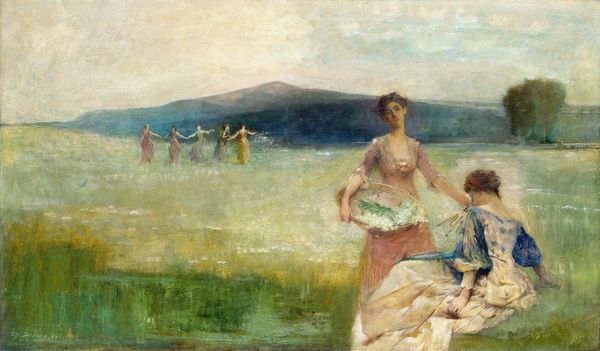 Curator: Charles Conder painted this scene, *Spring by the Sea,* but we aren’t sure exactly when it was made. The canvas measures about 50 by 92 centimeters. It’s at the Tate, made with oil. Editor: It’s incredibly dreamy, isn't it? Ethereal, like a half-remembered myth. The colours are soft, and everything seems bathed in a gentle light. Curator: Conder engaged with the aesthetic movement, valuing beauty and artistic expression above all else. You can observe how the use of oil paint allowed him to blend colors smoothly, creating this hazy effect. Editor: It feels like a moment suspended in time, a gathering of nymphs perhaps, caught in a fleeting reverie. The women seem to be present but also somehow distant, lost in their own world. Curator: Conder's use of classical figures within an Australian landscape reflects the cultural exchange happening in the late 19th century. Editor: I can almost feel the cool sea breeze and hear the soft murmur of the waves. It's a world I want to disappear into. Curator: That's a great way of looking at this picture. Editor: Yes, it just goes to show the power of capturing those feelings in paint, doesn’t it?