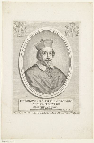 This engraving of Cardinal Nicolò Guidi di Bagno was made in Rome in 1657 by Guillaume Vallet. In the seventeenth century, Rome was the administrative center of the Catholic Church, and the Catholic Church was among the most powerful and influential institutions in Europe. The visual codes in this print speak to the Cardinal's high social status and position within the Church. The coat of arms at the upper left and right of the image immediately identify the subject as a member of the aristocracy. The Cardinal's clothing indicates his position within the Catholic Church. Prints like this one were a means of circulating images of important figures throughout Europe. By studying who was represented in prints, who produced them, and who collected them, we can better understand the social and political networks of the period. Detailed archival research gives us a better understanding of this artwork’s role in society.