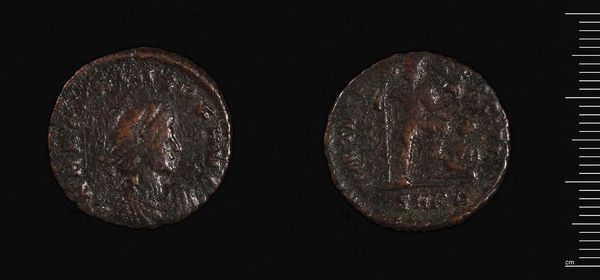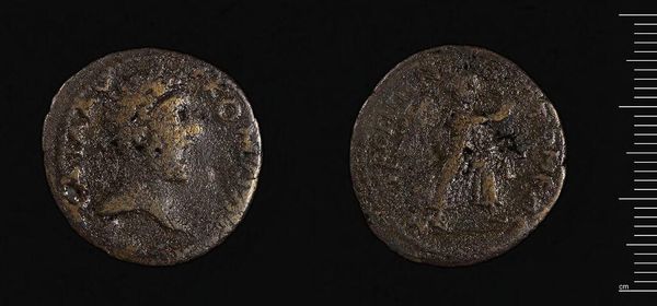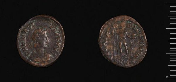 Editor: Here we have an "As or Dupondius of Faustina I." The details are worn, but I'm struck by the presence she holds within such a small space. What visual cues stand out to you? Curator: Notice the symmetry. On one side, Faustina's profile, regal and composed, is balanced by the figure on the reverse. The circular form itself reinforces a sense of wholeness and containment. Note the inscription framing her face, anchoring the image. Editor: So the composition itself creates a sense of power and authority? Curator: Precisely. The artist has cleverly used the limitations of the medium – the small, circular space – to amplify the symbolic weight of the image. It's a study in controlled form. Editor: I hadn't considered the impact of the shape itself! That's a great observation. Curator: Indeed. By considering the formal elements, we gain a deeper understanding of the work's intended effect.