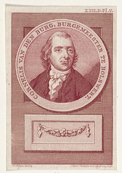 This is Reinier Vinkeles's "Portret van Pieter Leonard van de Kasteele," an engraving now held in the Rijksmuseum. The eye is immediately drawn to the structured layering of forms. A portrait of Pieter Leonard is framed in an oval, superimposed on a rectangular backdrop of densely etched lines, which creates a play of depth against the flat plane. Consider how this structured composition guides our perception. The portrait, rendered with fine lines, captures a sense of the subject's character and immediacy. Below, a still life adds another layer of visual interest, perhaps symbolizing the sitter’s attributes. The use of line in both the portrait and the objects below creates a unified visual language. Vinkeles’s precise engraving technique reinforces the formal structure and invites us to think about the relationship between representation and the underlying frameworks that support it. In contemplating its structure, the artwork encourages us to explore how meaning is constructed through form and representation.