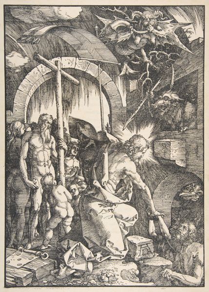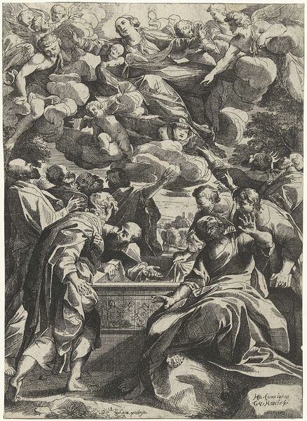 This is an anonymous engraving of the Resurrection of Christ, printed on paper. Produced during a time of significant religious and social upheaval, the image reflects the intersection of faith, power, and identity. We see Christ emerging triumphantly, his figure radiating light and strength. He is surrounded by Roman soldiers, who are depicted as helpless in the face of divine power. The representation raises questions about the artist’s own identity, caught as they were in the religious conflicts of the time. The inscription, "EXCITATUS EST PROPTER IUSTIFICATIONEM NOSTRAM" speaks to the complex relationship between divinity and humanity. The image evokes feelings of awe and reverence, but also prompts reflection on the broader societal implications of religious belief. Consider how the personal and emotional dimensions of faith are visualized here, amid the sweeping changes in societal values.