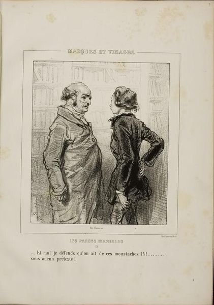 Curator: Paul Gavarni, a French artist born in the early 19th century, is the creator of this image entitled "What's with you, Mimie? The damned colic again?" Editor: It looks like a tense scene. The figures are close, yet emotionally distant, a sort of domestic drama captured in monochrome. Curator: Indeed. Gavarni's focus on line and form skillfully conveys the palpable sense of unease. Note how the cross-hatching adds depth to the figures, particularly Mimie herself. Editor: Given the likely printing methods of the time, I am curious about the role of the printmaker and how their labor influenced the final product we see now. Curator: A valid point. However, I'm more interested in the formal contrast between the darker tones of the man's coat and Mimie's delicate shawl. Editor: All the same, recognizing the social circumstances in which these prints circulated can help one to appreciate Gavarni's art in a new light. Curator: Yes, and by analyzing the lines and values, we can appreciate the emotional tension Gavarni masterfully depicted. Editor: And understanding the materials and labor involved reminds us of the many hands involved in bringing this image to life.