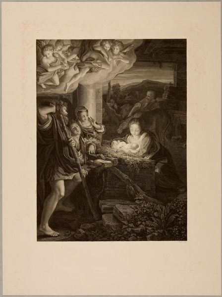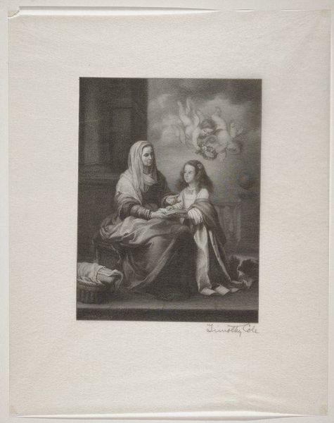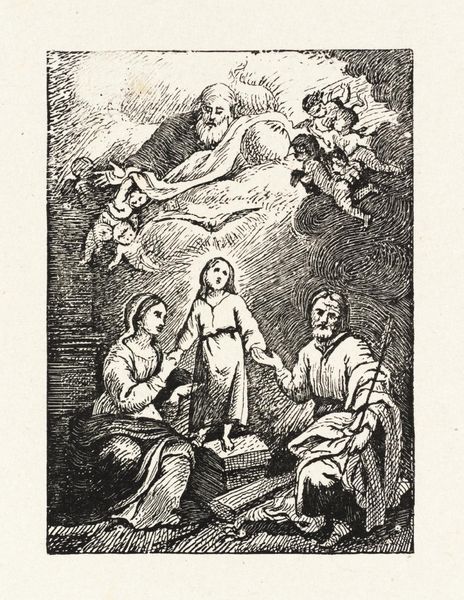 Curator: Let’s take a closer look at this artwork, "Holy Family" by François Eugène Augustin Bridoux, currently residing in the Harvard Art Museums. Editor: It has a wistful, almost dreamlike quality, doesn't it? All those soft edges and muted tones. Curator: Bridoux has certainly mastered the use of chiaroscuro here, guiding the viewer's eye through the divine narrative. Editor: The way the light pours down from above, illuminating the figures, it's like a spotlight on their sanctity. I wonder about the dove; is it a symbol of something specific? Curator: Ah, yes, the dove represents the Holy Spirit, completing the Holy Trinity alongside God the Father and Jesus as a child. Bridoux imbues the work with a profound sense of spiritual grace. Editor: It's funny how these stories continue to resonate, generation after generation, isn't it? Curator: Indeed. It reminds us of the enduring power of art to connect us with something greater than ourselves. Editor: It does offer a gentle moment of reflection, doesn't it? A reminder of faith and family, rendered with such ethereal beauty.