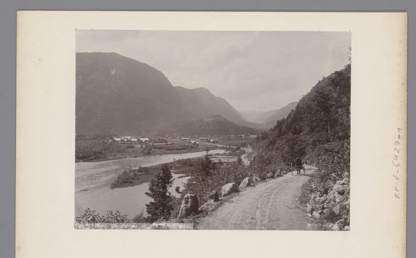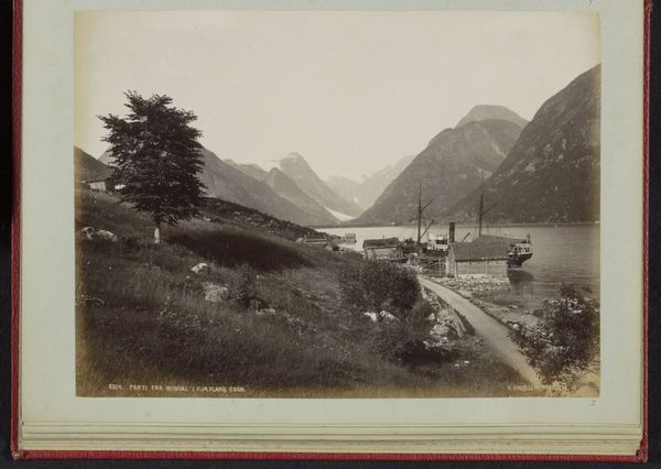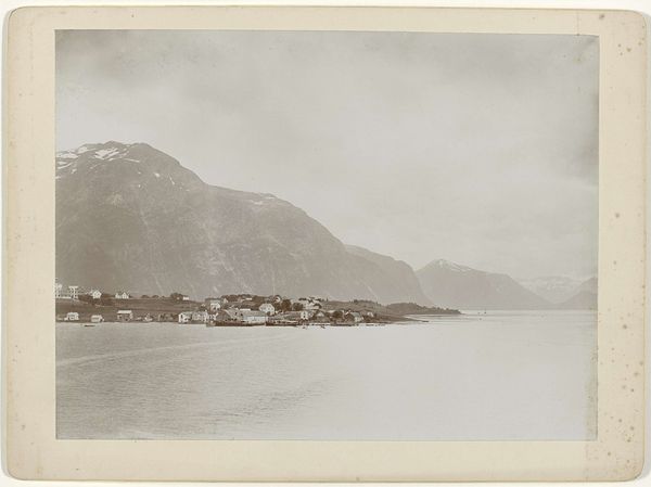 Curator: This is a photomontage by Knud Knudsen, dating from somewhere around 1870 to 1900. It’s titled, "Gezicht op Odda aan de Hardangerfjord in Noorwegen." Editor: There's a quiet stillness to it. The composition, with the mountains framing the water and small town, feels very deliberately composed—serene, almost. Curator: I find myself thinking about the laborious nature of creating photomontages at this time. Each element meticulously photographed, printed, and then assembled. Think of the darkroom work required! What does this laborious process say about nineteenth-century attitudes to photography? Editor: I'm intrigued by the selection of Odda itself, which had growing importance at this time. Situated within these striking natural landmarks of fjords and mountains, its existence has strong links with both the tourism and labor in the mines of this region. What power structures shaped who got to appreciate the scene? And who had to work? Curator: I see the architecture, especially that prominent building with the multiple windows. The contrast between that structure and the rugged mountains underscores the burgeoning presence of industry in a space formerly dominated by nature. Look at the materiality itself, the subtle grain of the print—there's such a rich, tactile quality. Editor: Absolutely, but there's also something of an imposed harmony, maybe even propaganda, happening. These romantic views frequently obscure the extractive industries that reshape landscapes and impact labor practices. The focus is on a serene depiction, potentially idealizing and whitewashing any harsh realities. Who held the camera and decided what parts of Odda to expose? Curator: That’s an excellent point. It's precisely the friction between idyllic image and material reality where the photograph's complexities reside. The image reflects social change at the time. Editor: Exactly, and examining photography like this can help us disentangle constructed realities and understand social shifts occurring, one print at a time. Curator: Precisely! It really brings attention to the layers of choices embedded within the frame. Editor: Yes, this image holds complexities we should be ready to examine.