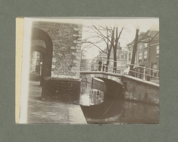 Editor: This gelatin-silver print, "Gezicht op de Bloedbrug in Delft," made sometime between 1920 and 1940 by G. Hidderley, presents a quaint cityscape. It's so soft and atmospheric. What catches your eye when you look at this image? Curator: The bridge itself, and its reflection, create a powerful circular motif. Bridges, of course, are powerful symbols of transition, of connection between two worlds. But what do you think the reflection adds to this symbolic load? Editor: I guess the reflection makes it less about physical travel and more about mirroring and the subconscious? Like the bridge isn't just going somewhere, it's connecting conscious and unconscious thoughts. Curator: Precisely. Notice also how the church looms in the background. Its architectural style would certainly call to mind permanence, longevity, even divine authority. Editor: Yes, its placement suggests how civic life and religious belief co-existed. The bridge, literally, is dwarfed by it. I guess it signifies a hierarchy. Curator: Indeed. What I find intriguing, then, is how this quiet, everyday scene of the bridge becomes imbued with these larger cultural ideas simply through composition. How potent the vernacular, elevated! What a beautiful tension, isn't it? Editor: It is. Thinking about it, Hidderley captures not just a view, but a visual representation of history and cultural memory embedded within an ordinary space. It encourages reflection on cultural symbols present in the everyday!
